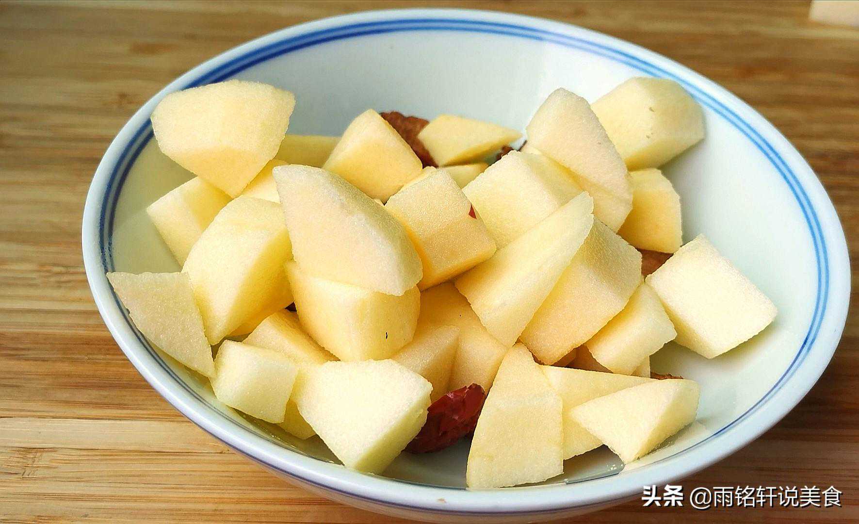 第三步:把苹果削去皮切小块,中间的核就不要了,切好放碗里备用。