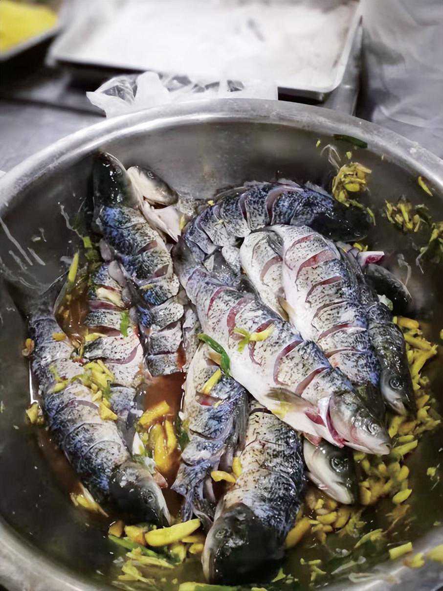 李盛开做的脆皮鱼只选草鱼,草鱼的身材更修长,鲤鱼的更扁平,从成菜造型上看,草鱼比鲤鱼更容易立起来,造型更好看。此外,草鱼的脊背肉更厚实,鲤鱼的脊背肉更单薄,在给鱼身剞刀时,草鱼的连刀鱼片厚薄均匀,造型美观,而鲤鱼的则要差些。李盛开剞鱼采用牡丹片刀法,也非常适宜草鱼的鱼型,可以说是为草鱼量身定做的吧,即先直刀在肉厚处剞至刚到鱼骨,再平刀向鱼头方向推进。这样剞出来的鱼形更加饱满、完美。