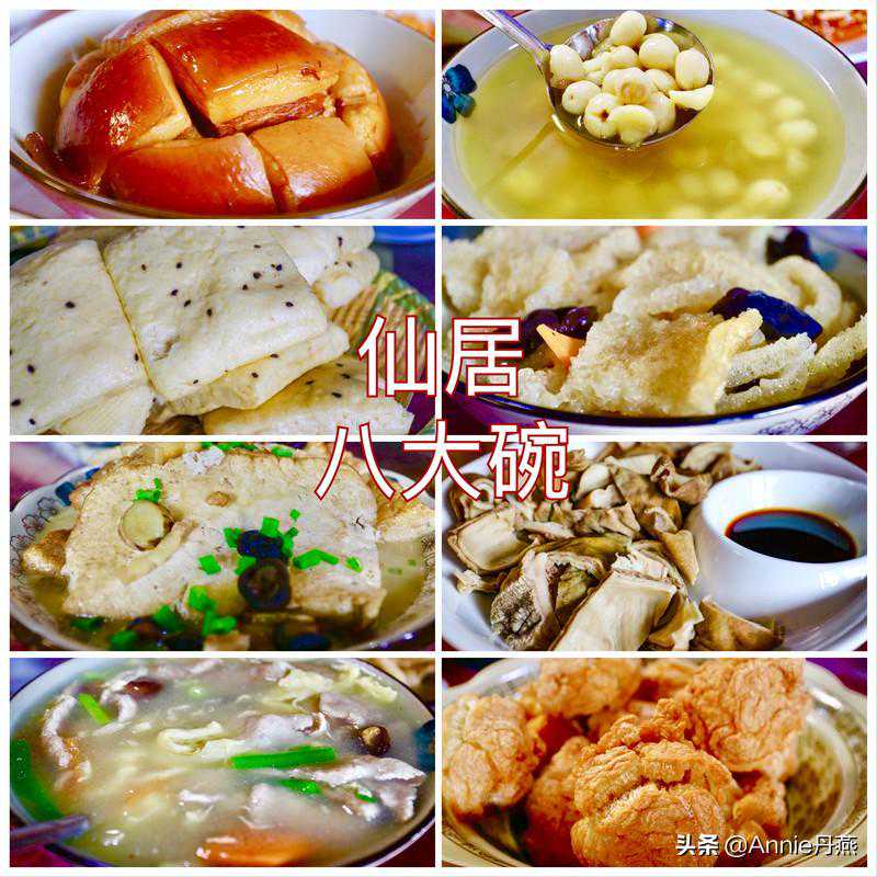 仙居八大碗是浙江仙居最正统的菜谱,历史悠久。而且仙居八大碗是别地吃不到的乡家传统风味,仙居传统八大碗专做当地代表菜的酒家。八大碗指的是莲子(白扁豆)、海参、泡鲞(xiang)、大鱼、翻碗肉、敲敲肉相传,八仙过海时惹怒了东海龙王,八仙战了很久都没有取得胜利,又累又饿,就出去寻找食物。八仙当时兴起,一人做了一道好菜(即采荷莲子、湘子海参、钟离翻碗肉、国舅泡鲞、洞宾大鱼、铁拐敲肉、仙姑肉皮泡、国老豆腐)以示庆贺。