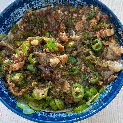 11、将辣椒圈蒜末放入装好茄子的碗中