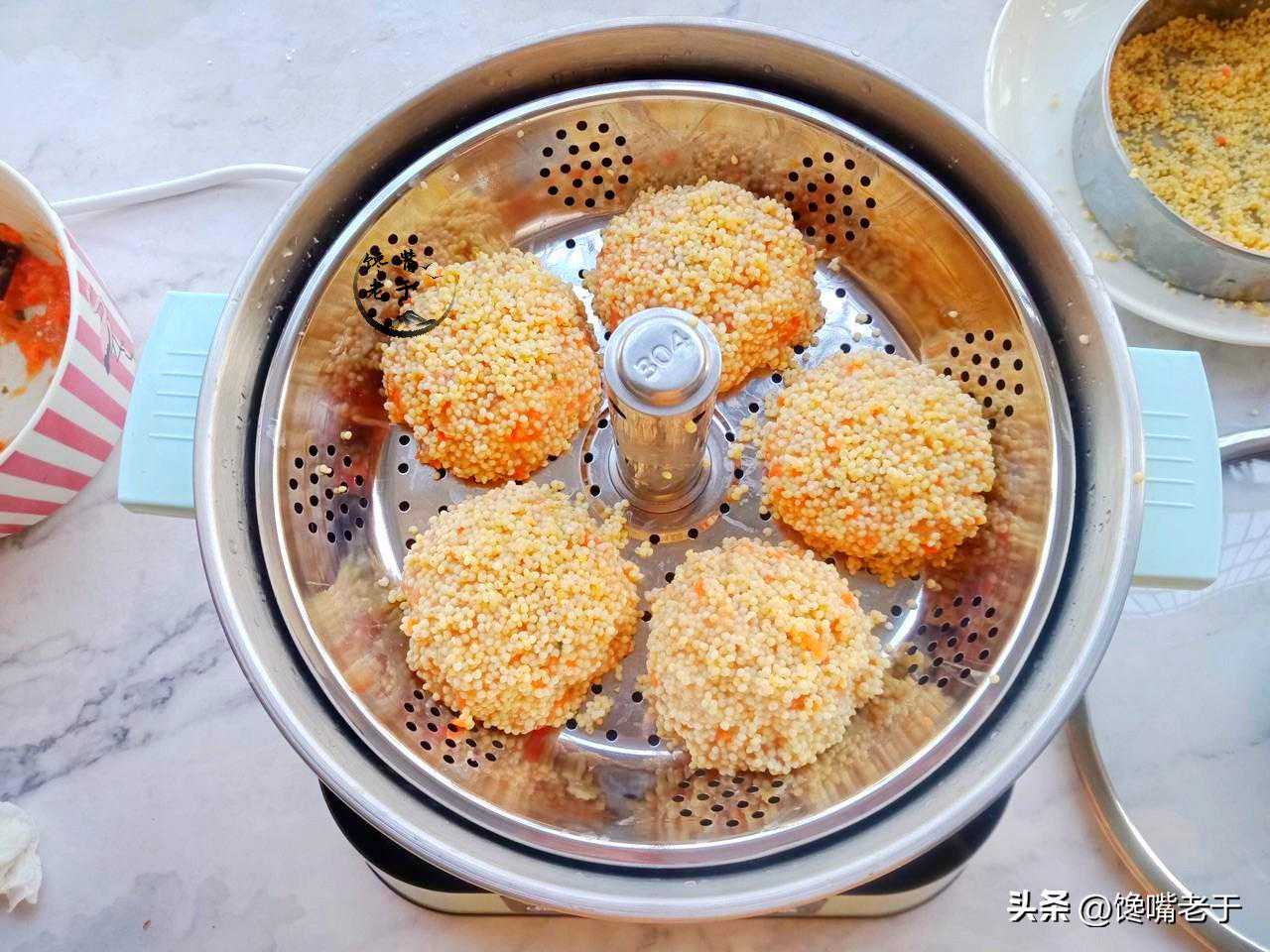 步骤二:把泡好的小米沥干水分备用,取适量的肉馅团成丸子,然后均匀的裹上小米后放入蒸锅,接着在每一个丸子上点缀一个枸杞,开大火上汽后大约再蒸18分钟即可,出锅后撒上一点葱花点缀。