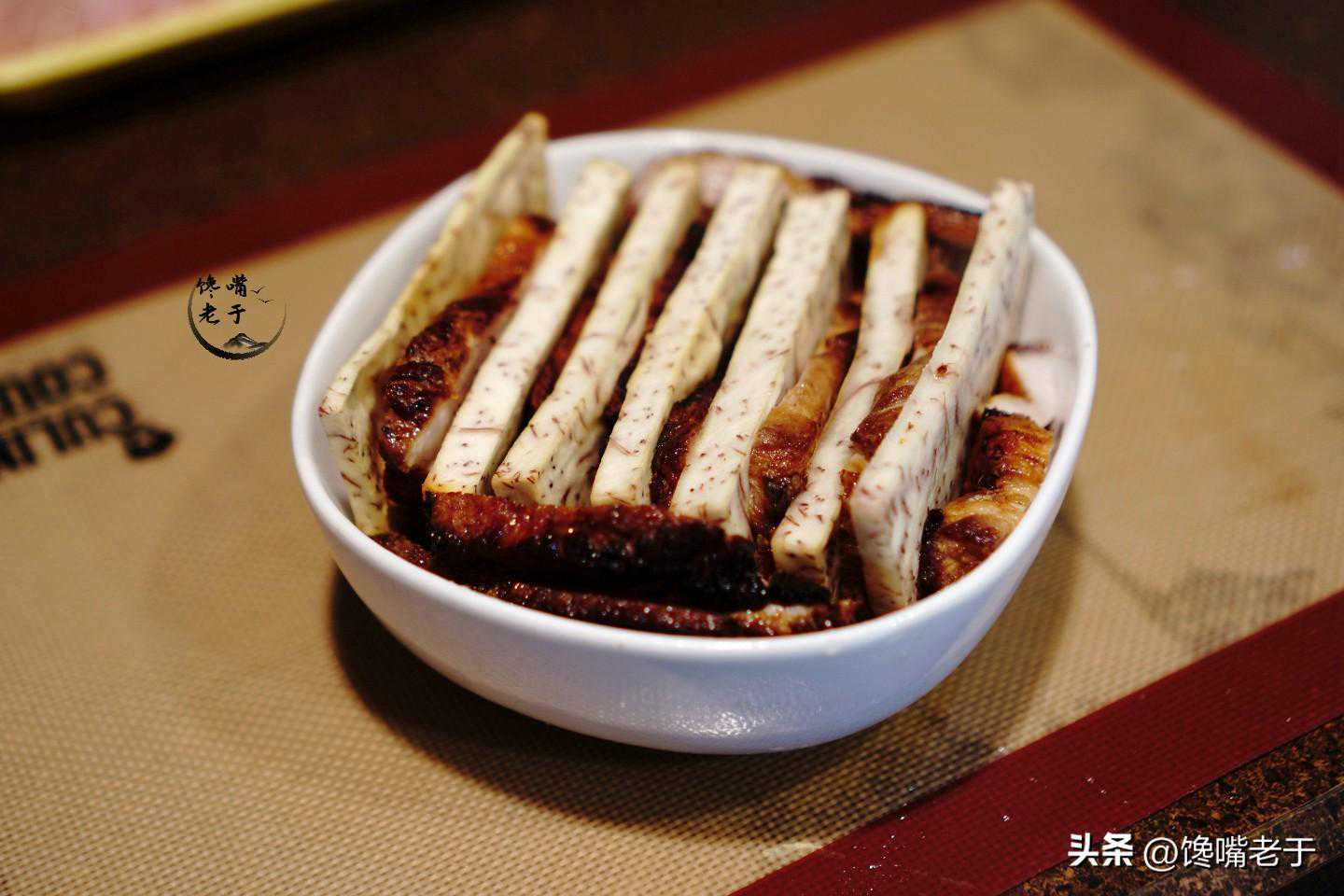 步骤二:锅中加入适量的油,油温烧至6成热时放入芋头片,炸至表皮啊变硬,边角上带有金黄的颜色即可。接着五花肉入油锅烹炸,全程中小火,炸至猪皮成金黄色后捞出,最后切成1厘米的厚片,取一个大碗,一片芋头一片肉摆放整齐。注意,五花肉的肉皮朝下。