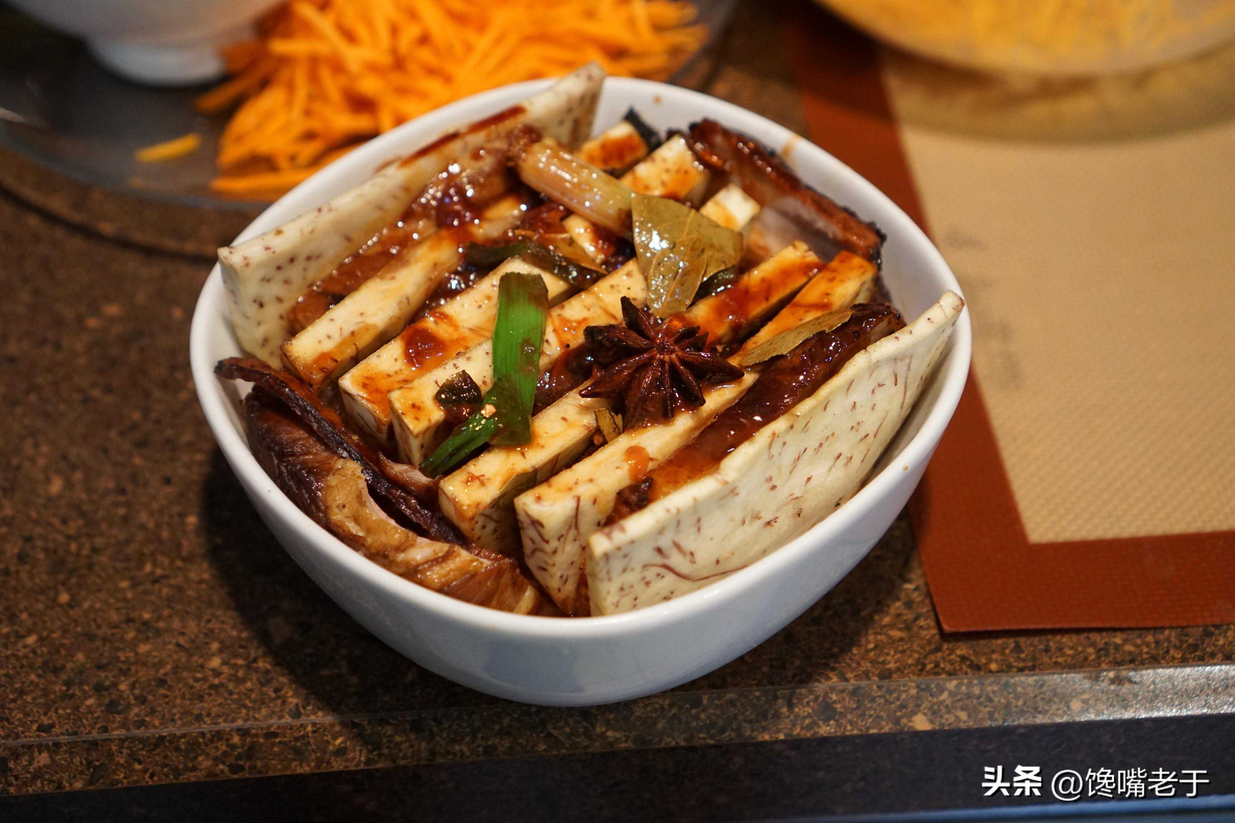 二、芋头扣肉食材:带皮五花肉、荔浦芋头、葱、八角、香叶料酒、生抽、老抽、蚝油、冰糖、腐乳、腐乳汁