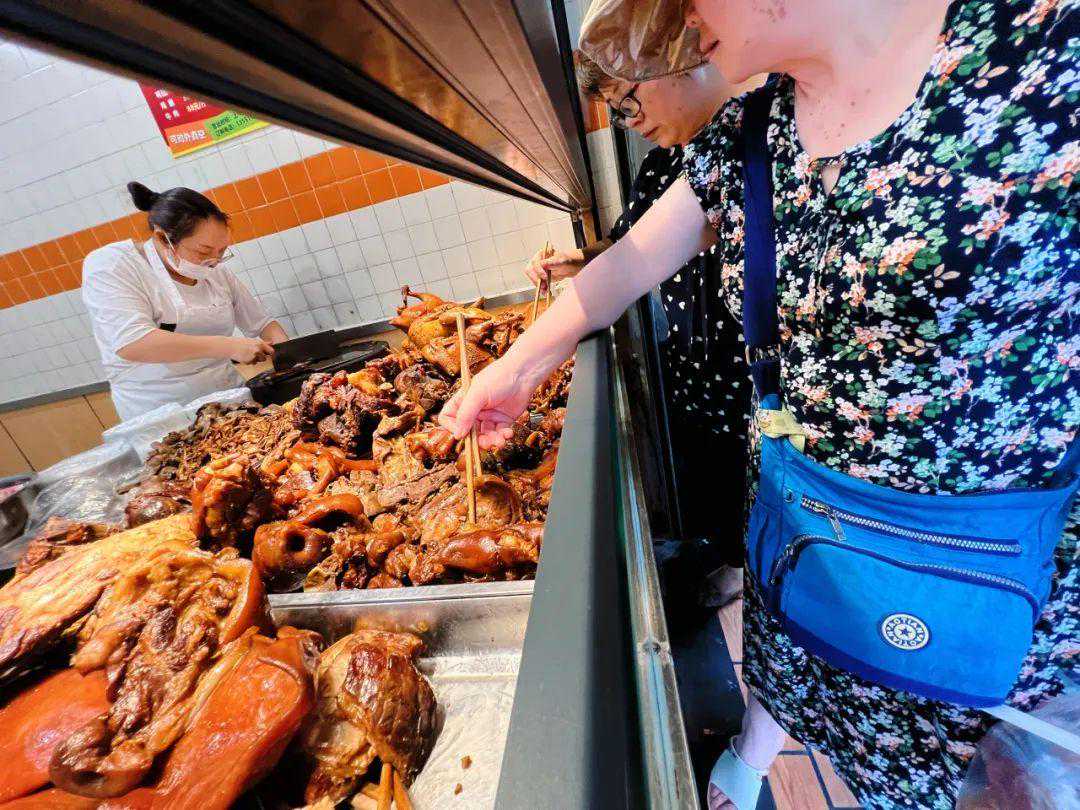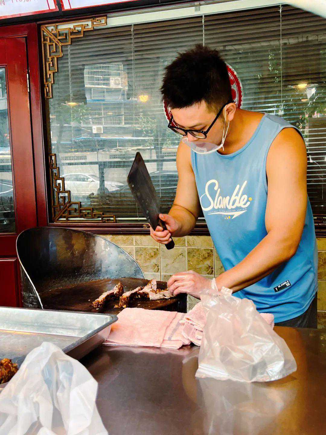 透过反光的玻璃,仔细一看,剁肉的竟然是一个年轻小哥,手法熟练,快而不乱,不知道是不是老卤店的继承人。