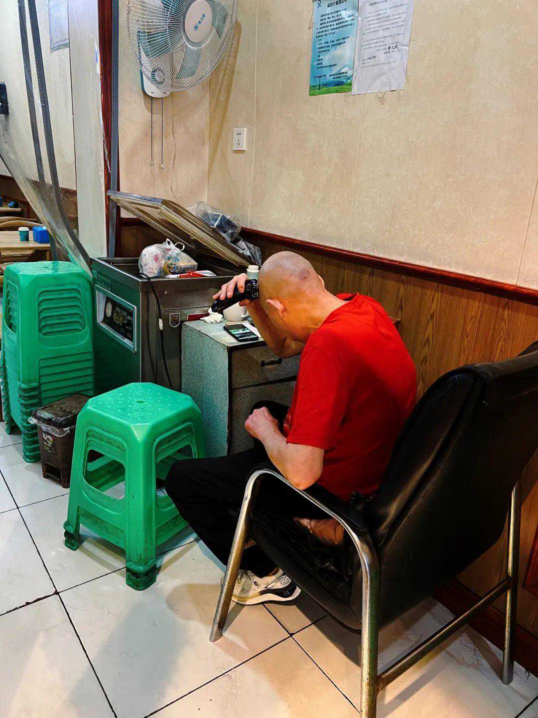 进门一个大爷正在用剃须刀来回搓着自己的光头,他就是鄢大叔,鄢大叔的父亲大家都叫他鄢老头儿、鄢大爷。