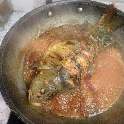 4、然后加大酱少许,酱油,糖,耗油,盐,料酒,加一瓶啤酒,少许老抽上色,然后再下鱼,水不够就再加点水