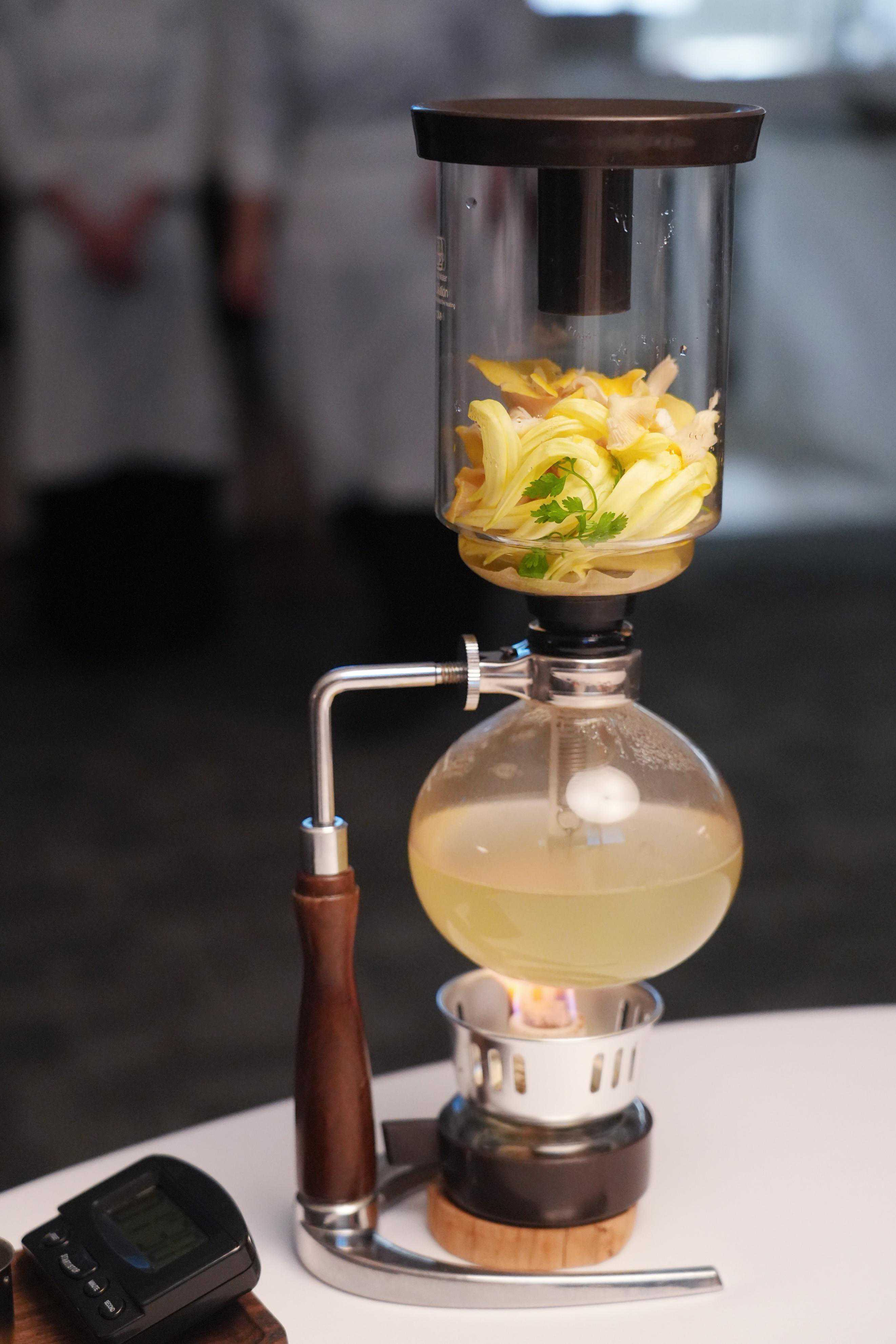 这道菜很有意思,是在桌上现做的,像做实验似的。汤是通过虹吸的方式,萃取菊花的味道。