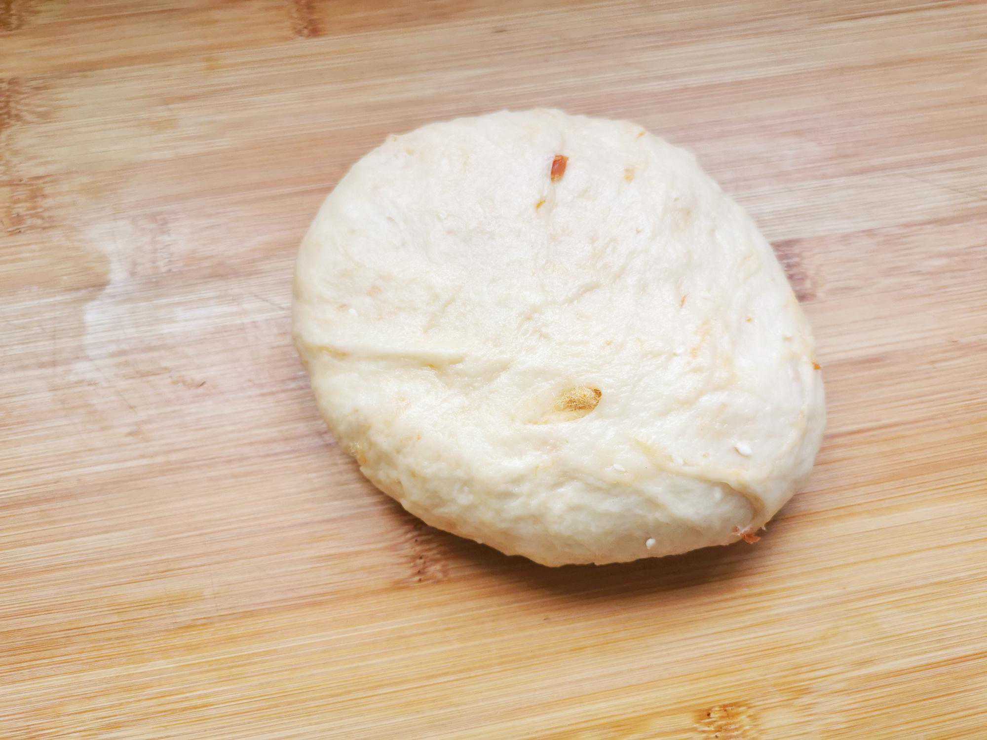 2、揉好的面团盖上保鲜膜放在冰箱冷藏发酵一夜,所以我是头天晚上揉好面,第二天早上直接拿出来烤的。早上将面团取出来,加入一些肉松揉进去。