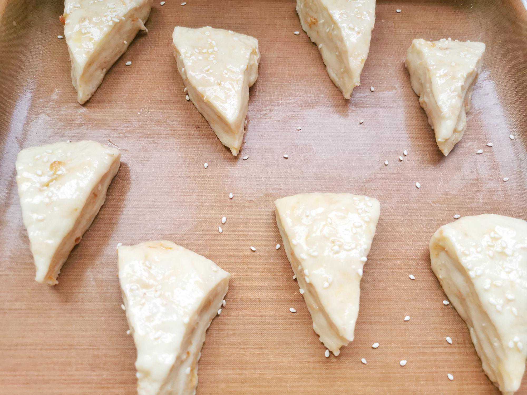 4、分割好的面团刷上薄薄一层蛋液,撒上白芝麻。