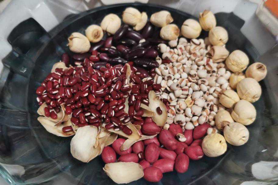 1、准备一个空盘,放入30克花生,30克赤小豆,30克红芸豆,20克莲子,30克薏米,15克干百合,按照这个配方备齐。