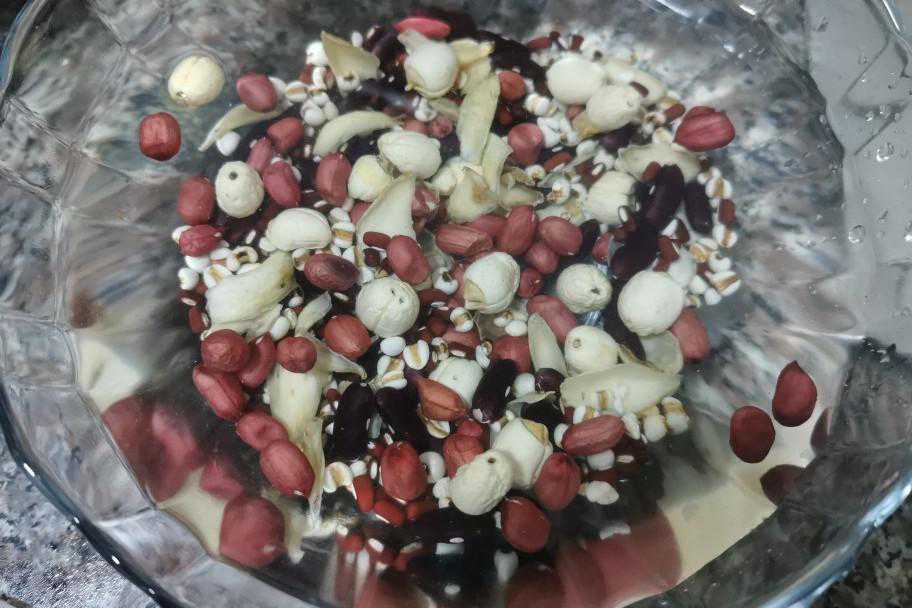 2、将所有食材清洗两遍,冲掉表面杂质,提前一天晚上放入,用清水浸泡12个小时,这样有利于缩短煮粥的时间。