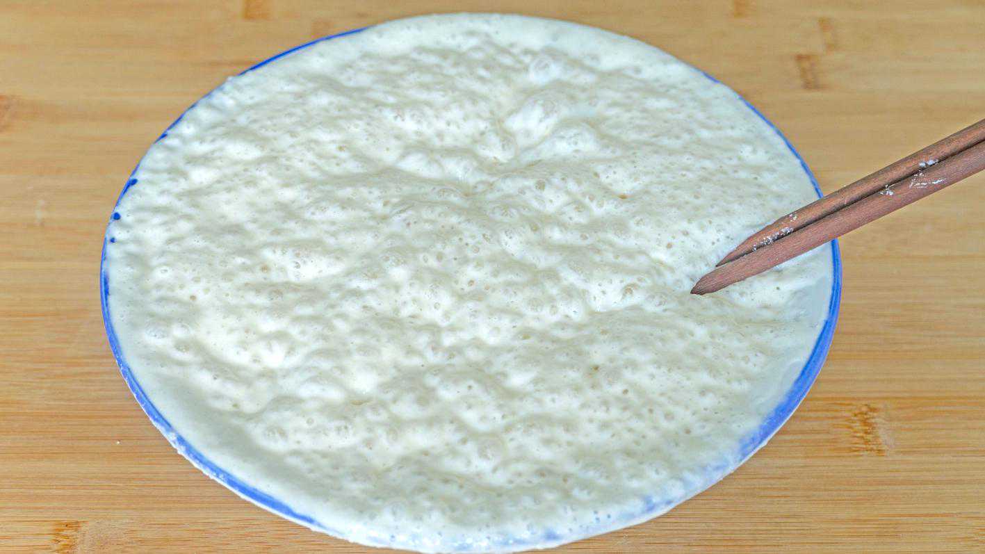 5、醒好的米浆表面会有大气泡,加2克小苏打,搅拌至顺滑细腻的状态;