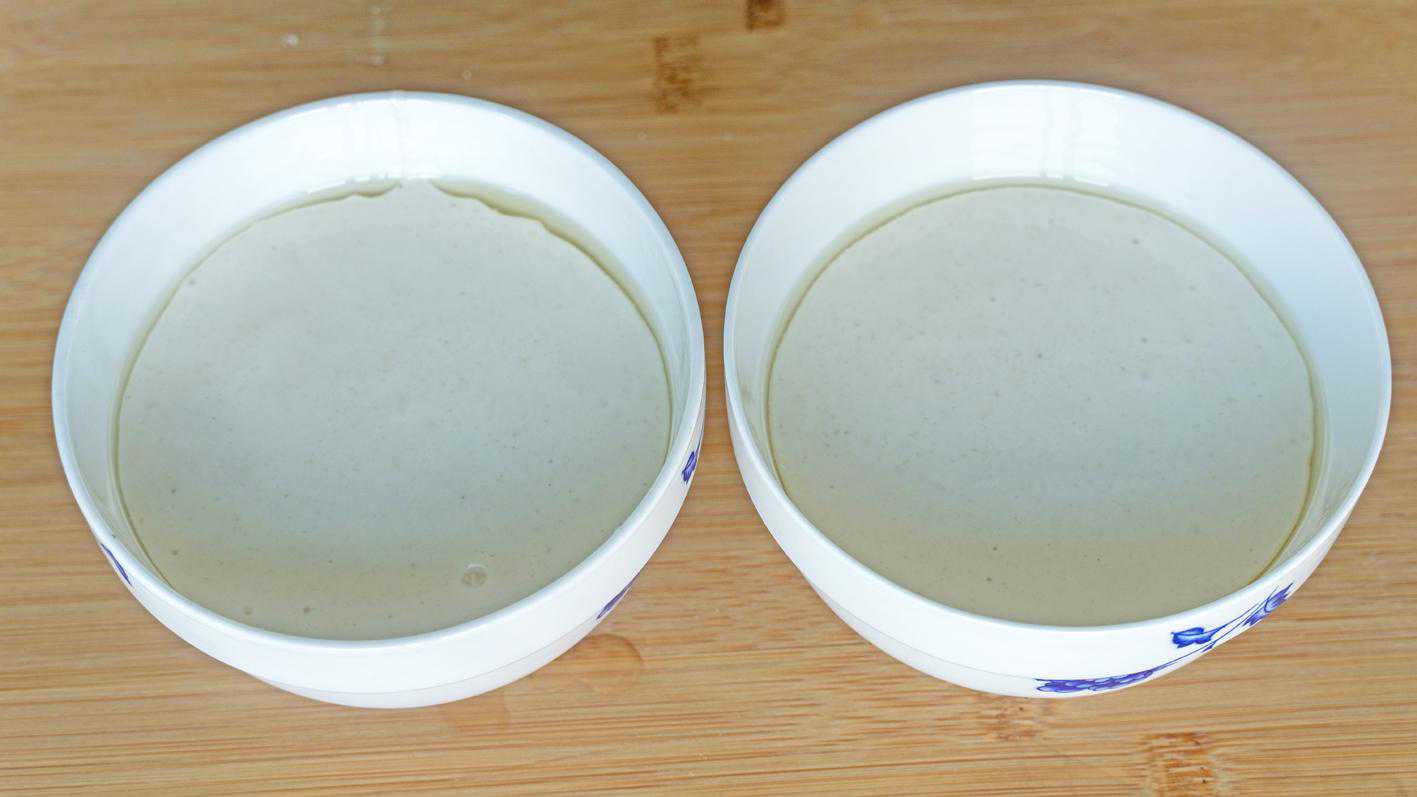 6、小碗刷油防粘,倒入米浆,七分满就够了,装入碗中后静置十分钟,静置的时候就可以提前烧水了;