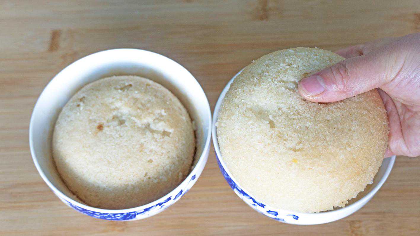 7、面糊静置10分钟以后震一下小碗,去除表面的大气泡,然后放入上汽的蒸锅中,大火蒸40分钟,关火后焖5分钟避免塌陷再出锅,稍微的放凉后脱模,完整的大米发糕就做好了;