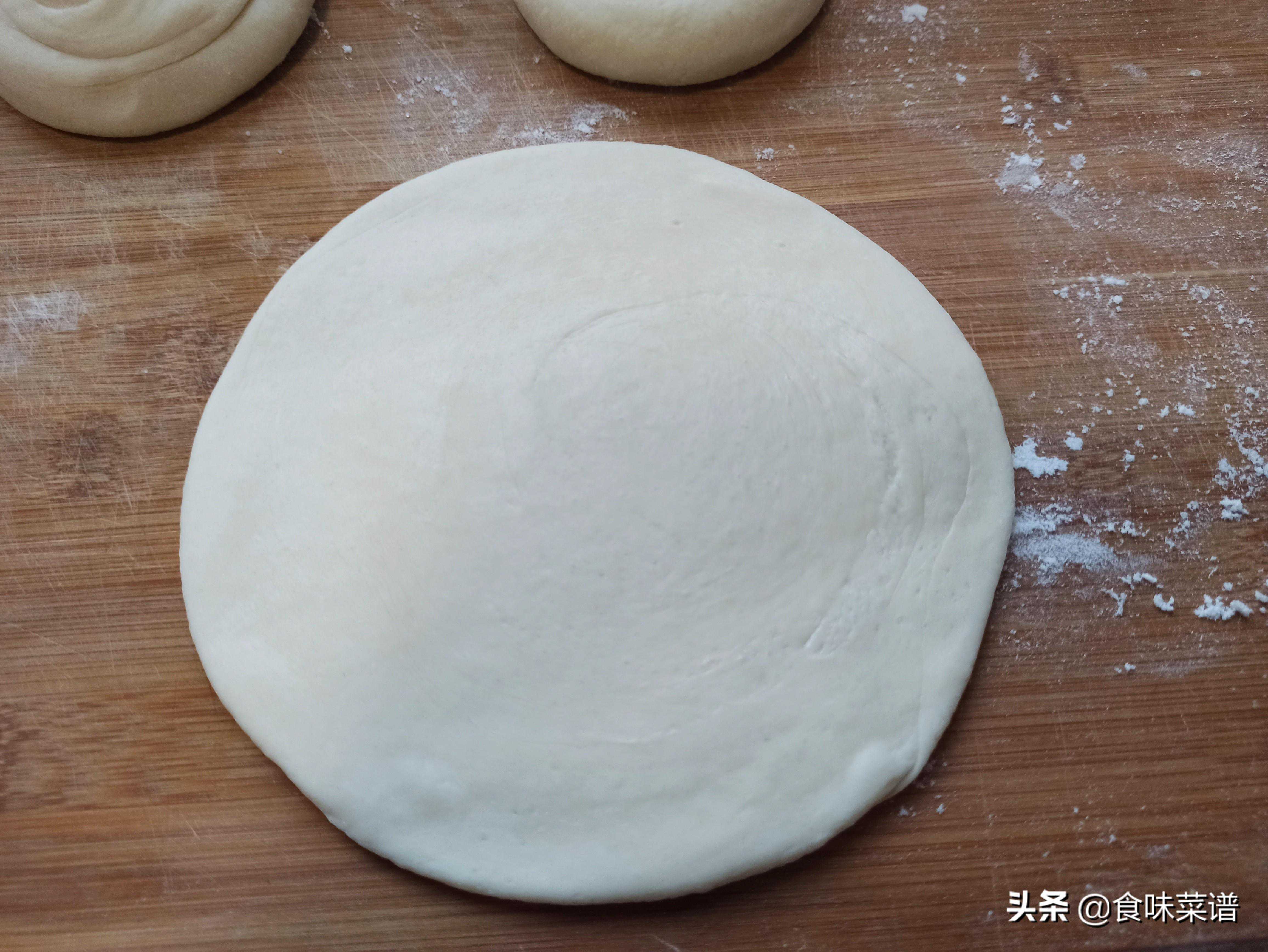 8、取出一个生胚,擀成一张略厚的饼皮,切记不可用力,别把分层压死。
