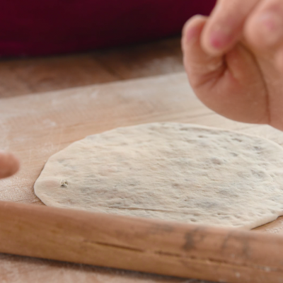 23、将醒好的面用菜刀切成小剂子,用擀面杖擀成圆饼状然后加入馅料