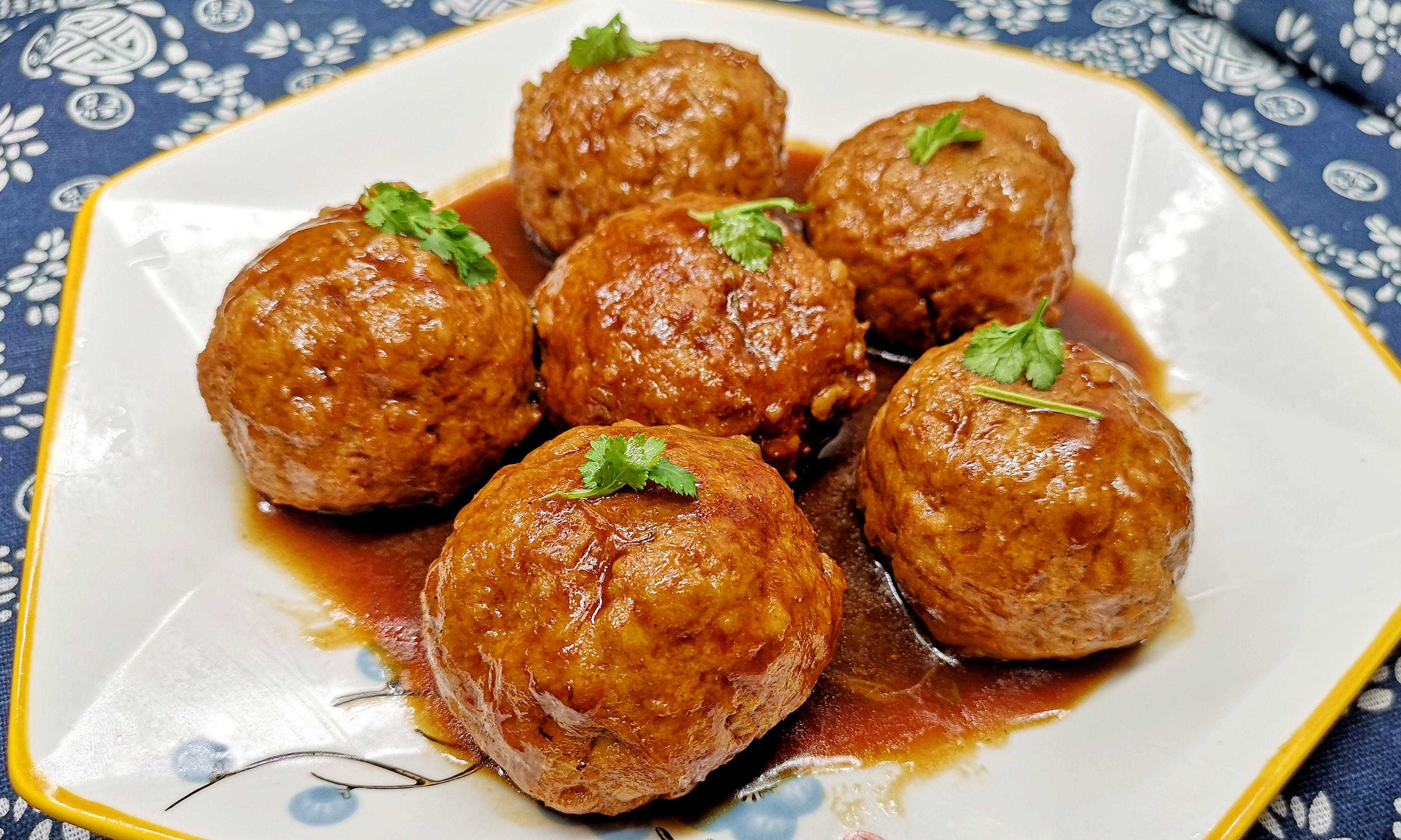2.热锅加油,烧热后放入丸子,煎至金黄,另起锅,加入食用油,爆香蒜末,加入老抽、酱油、糖,炒匀成汤汁,倒入少量水,加入丸子,中小火炖煮10-15分钟,汤汁收浓后,将丸子装盘,淋上汤汁,撒上香菜点缀即可。