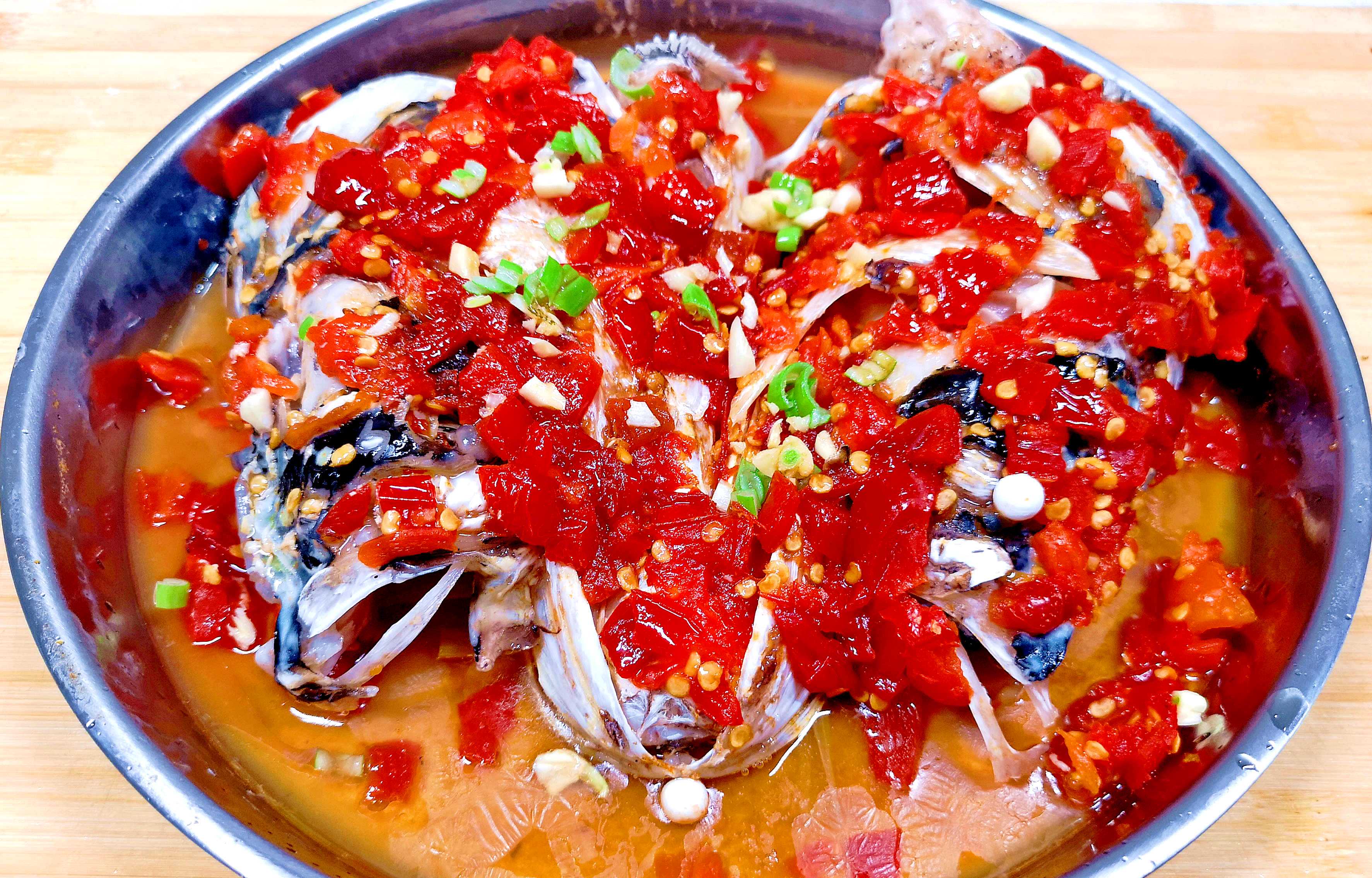2.在鱼头表面均匀涂抹剁椒,准备一个蒸盘,底部铺上葱姜蒜末,将腌制好的鱼头放在蒸盘中,上面撒上适量的剁椒,放入蒸锅,开火蒸5-10分钟,至鱼头熟透。另起锅,烧热食用油,浇在蒸好的鱼头上,以释放香味,剁椒鱼头即可享用。
