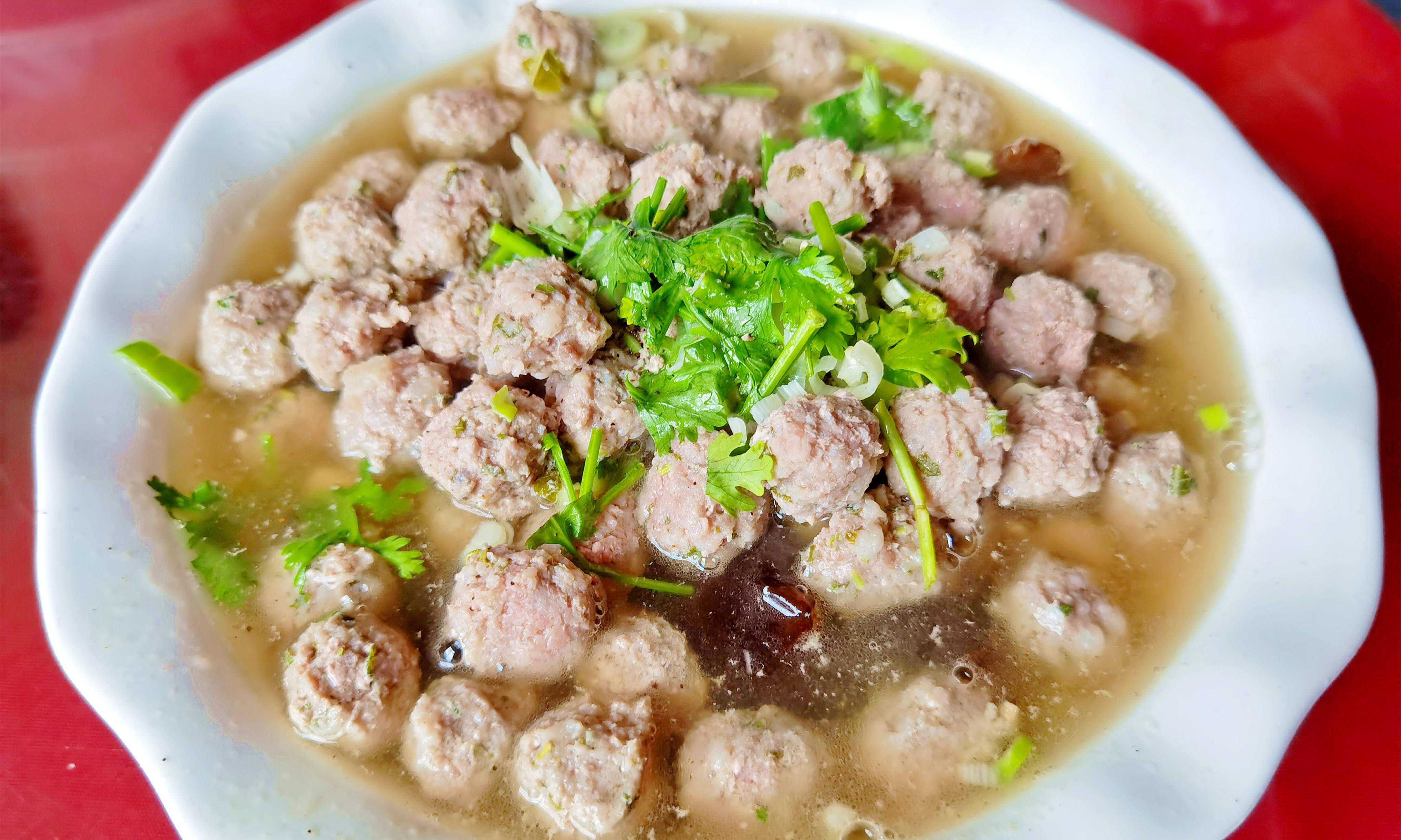 2.热锅加油,放入葱花和姜丝炒香,加入适量的清水,大火煮开后,下入肉丸,煮至肉丸浮起,加入适量的盐、胡椒粉调味,关火后,撒上葱花和香菜,即可食用。