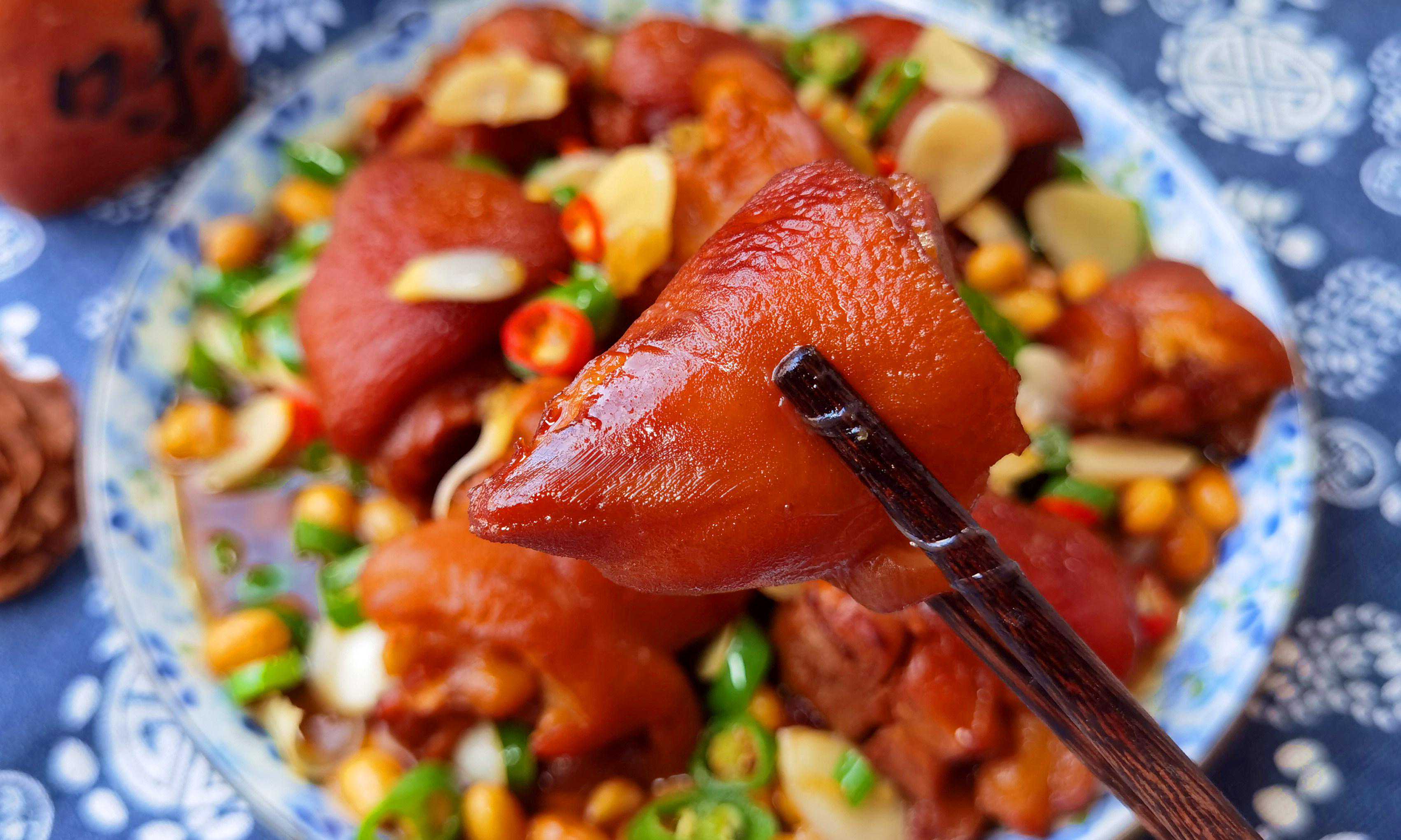 材料:猪蹄、黄豆、葱、姜、蒜、八角、香叶、桂皮、干红辣椒、盐、冰糖、啤酒、料酒、蚝油、老抽、食用油。