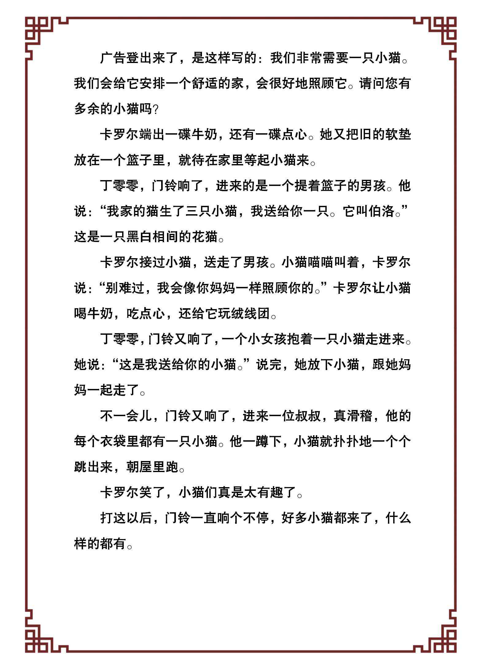 一只蜻蜓飞来了。小猫看见了,放下钓鱼竿,就去捉蜻蜓。蜻蜓飞走了,小猫没捉着,空着手回到河边来。小猫一看,老猫钓着了一条大鱼。