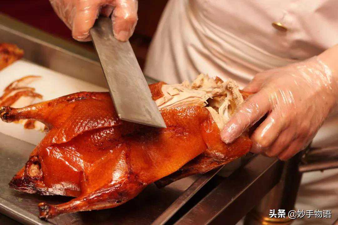 北京烤鸭第一种吃法:据说是由大宅门里的太太小姐们兴起的。她们既不吃葱,也不吃蒜,却喜欢将那又酥又脆的鸭皮蘸了细细的白糖来吃。此后,全聚德的跑堂一见到女客来了,便必然跟着烤鸭,上一小碟白糖。