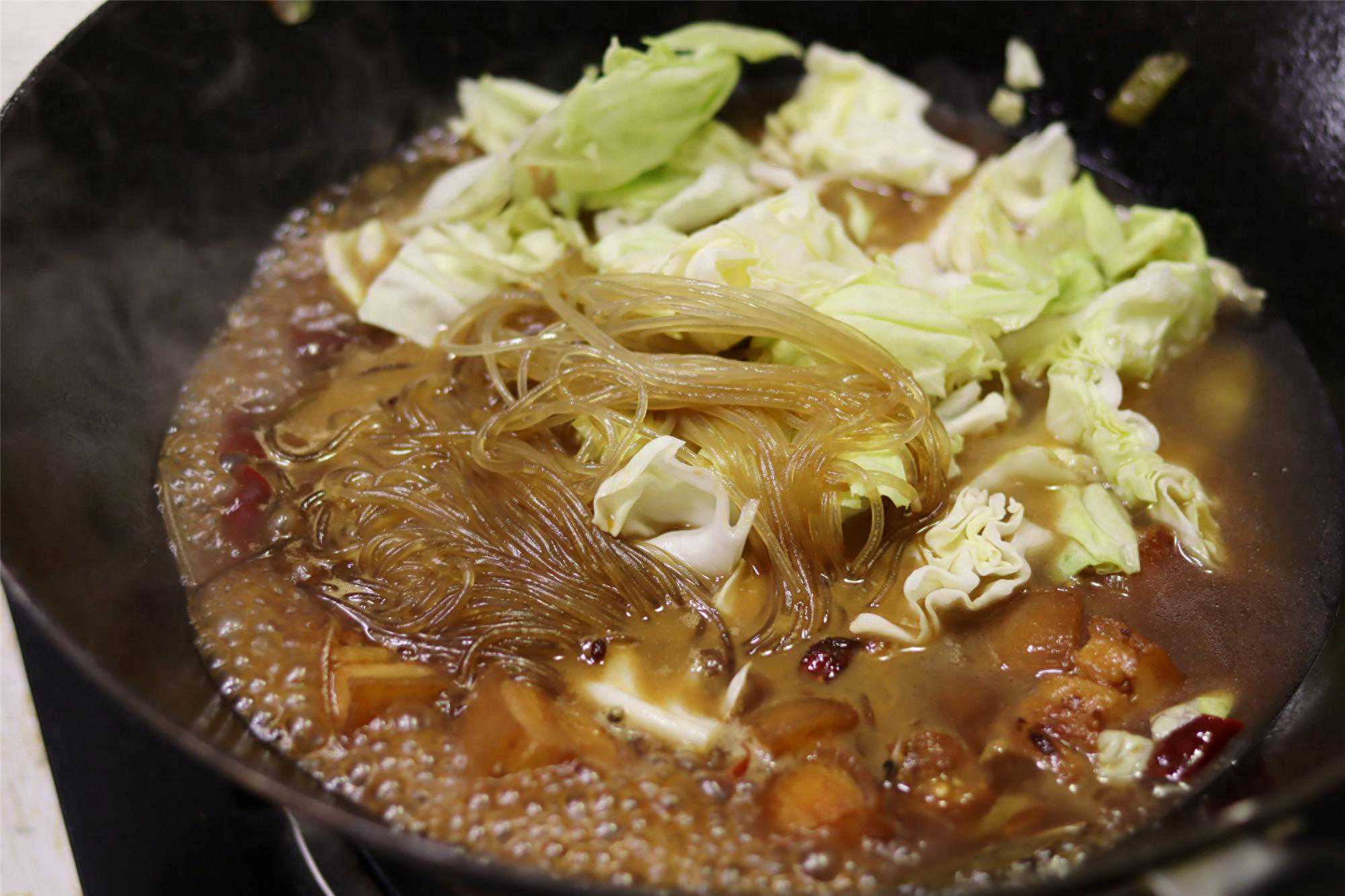 6、加入泡软的粉丝、大白菜,搅拌均匀后,盖上锅盖再焖煮15分钟,让油脂和调味料充分融入到食材中。