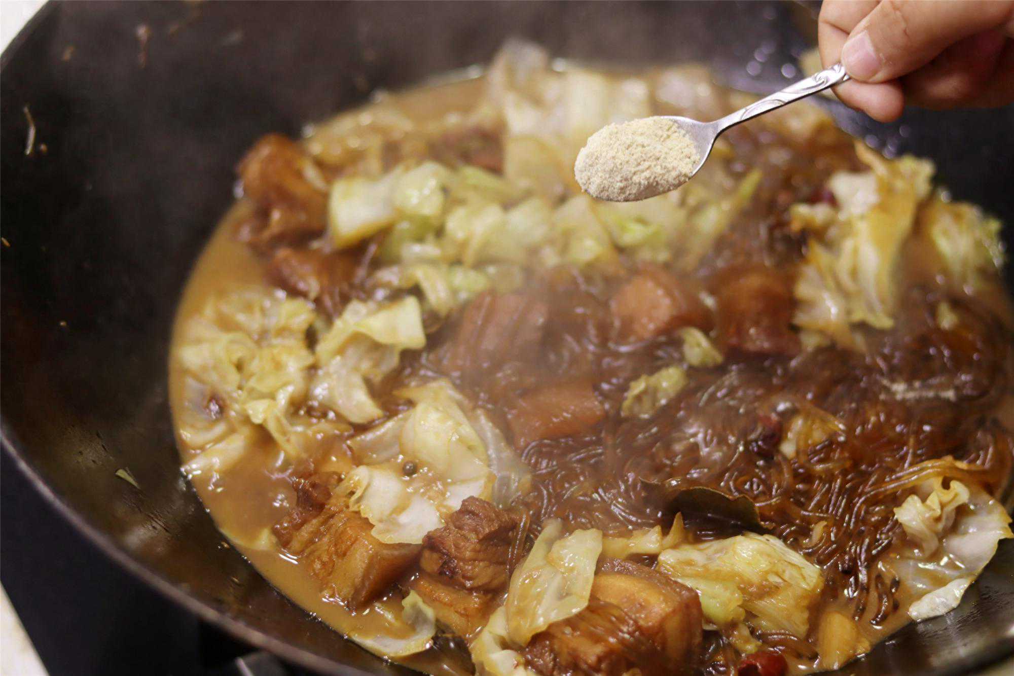 7、最后汤汁收紧的时候,加入适量的胡椒粉、盐和鸡精调味,搅拌均匀,淋上半勺香油即可出锅,香喷喷热腾腾的猪肉炖粉条就做好了。