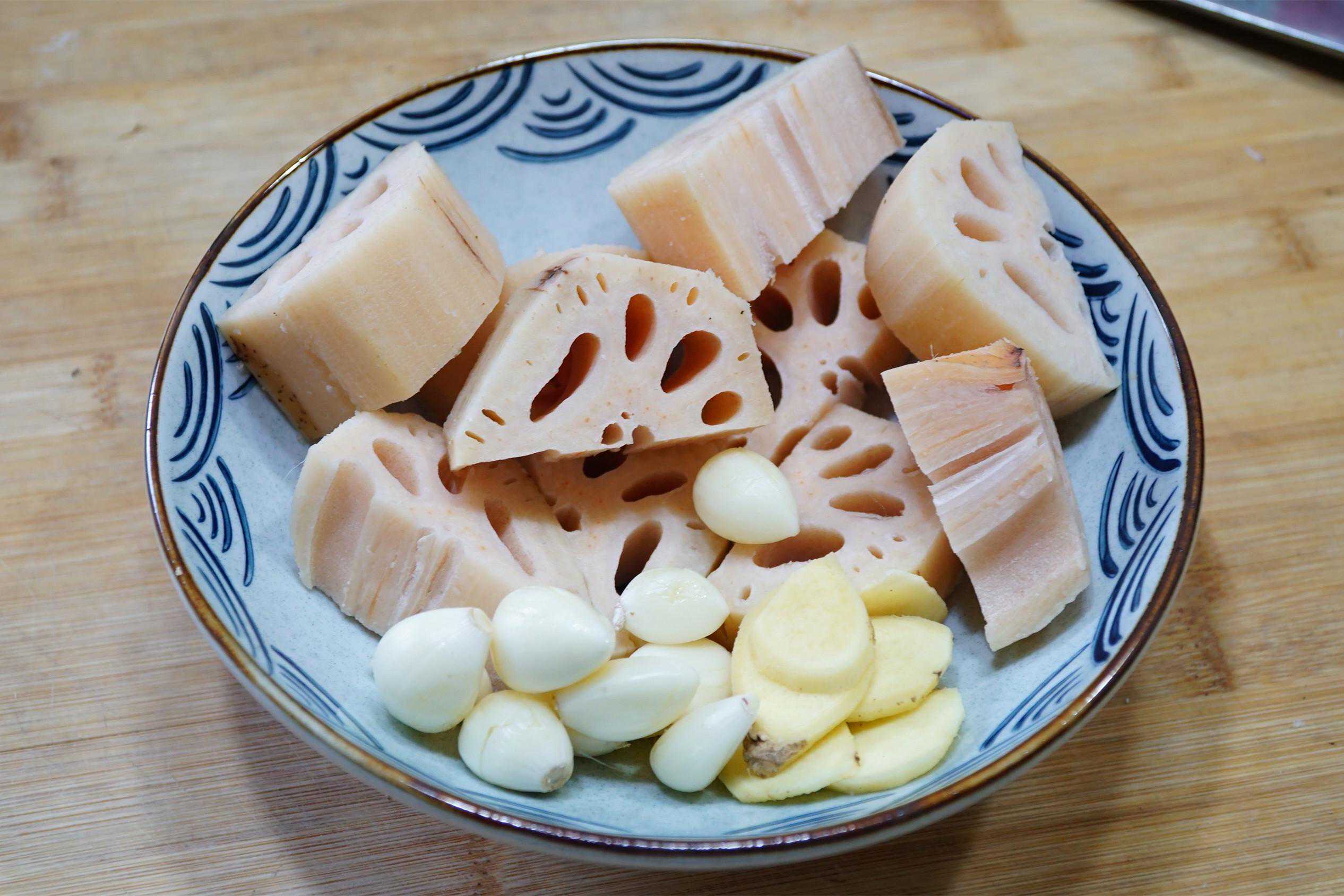 1、排骨放入盆中,用清水浸泡半个小时,冲洗掉血水备用。莲藕去皮后切成大块,莲藕这里最好选用7孔的莲藕,比较软糯香甜,1头大蒜去皮掰成蒜瓣备用,姜切片,干香菇泡发。