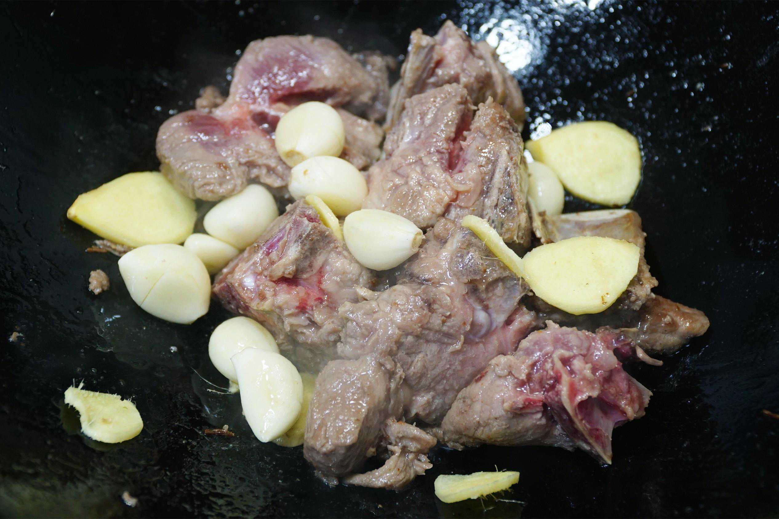 2、锅中少量的油,放入排骨炒到变色后,加入蒜瓣和姜片炒出香味。
