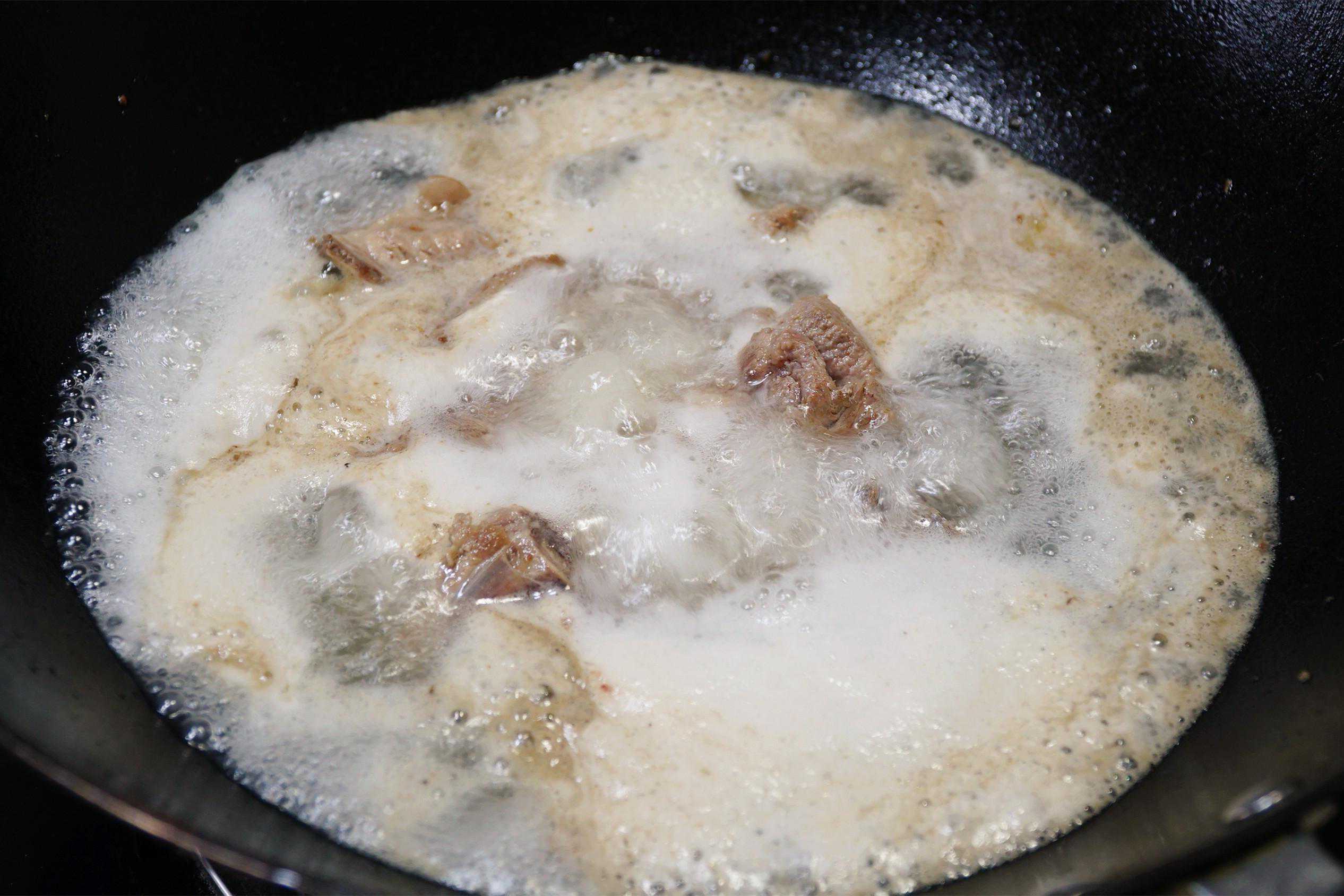 3、炒好的羊肉加入比较多的热水,开大火打开锅盖煮大约20分钟。