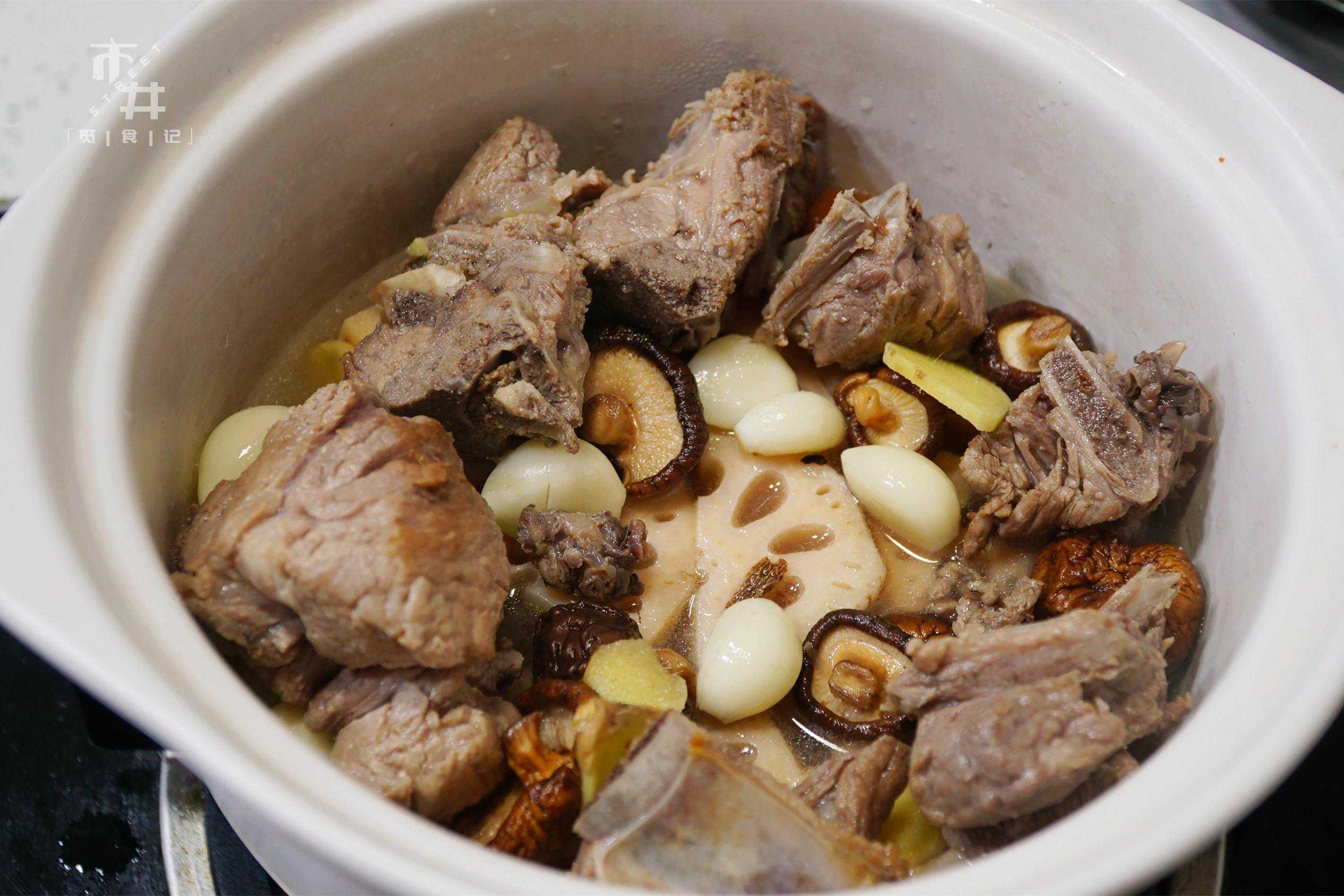 4、砂锅内底部铺上莲藕,干香菇,将煮过的排骨连汤带肉一起倒入砂锅中,盖上锅盖中小火炖15分钟。