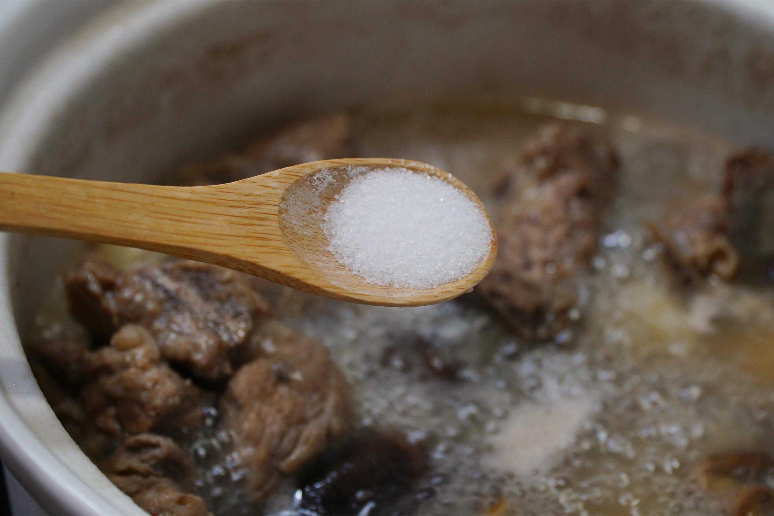4、加入没过食材的热水,加少量的糖,适量的盐,中火煮30分钟,最后大火收汁即可。