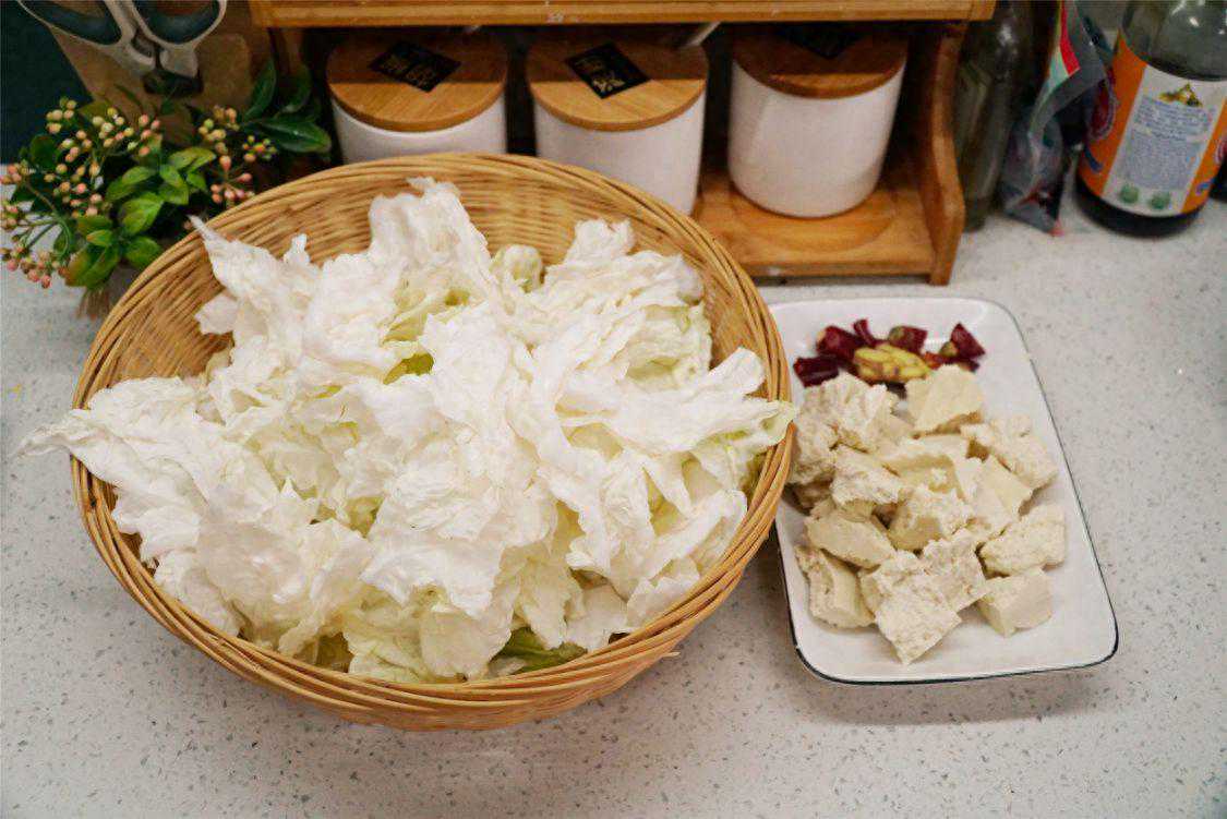 准备食材:白菜一颗、老豆腐一块、花生酱一大勺、葱、姜、干辣椒、盐、白糖、鸡精。