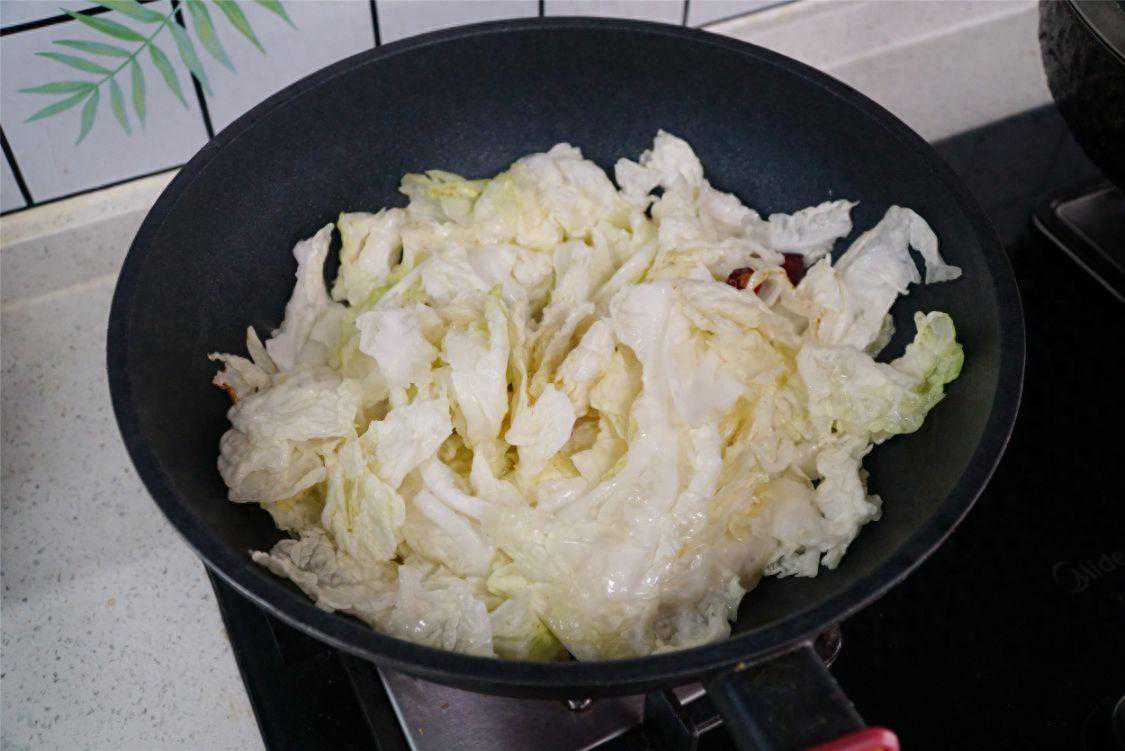 2、起锅烧油加热后,倒入准备的葱、姜片和干辣椒,炒出香味,倒入撕好的白菜叶翻炒均匀,炒至白菜叶脱水变软。