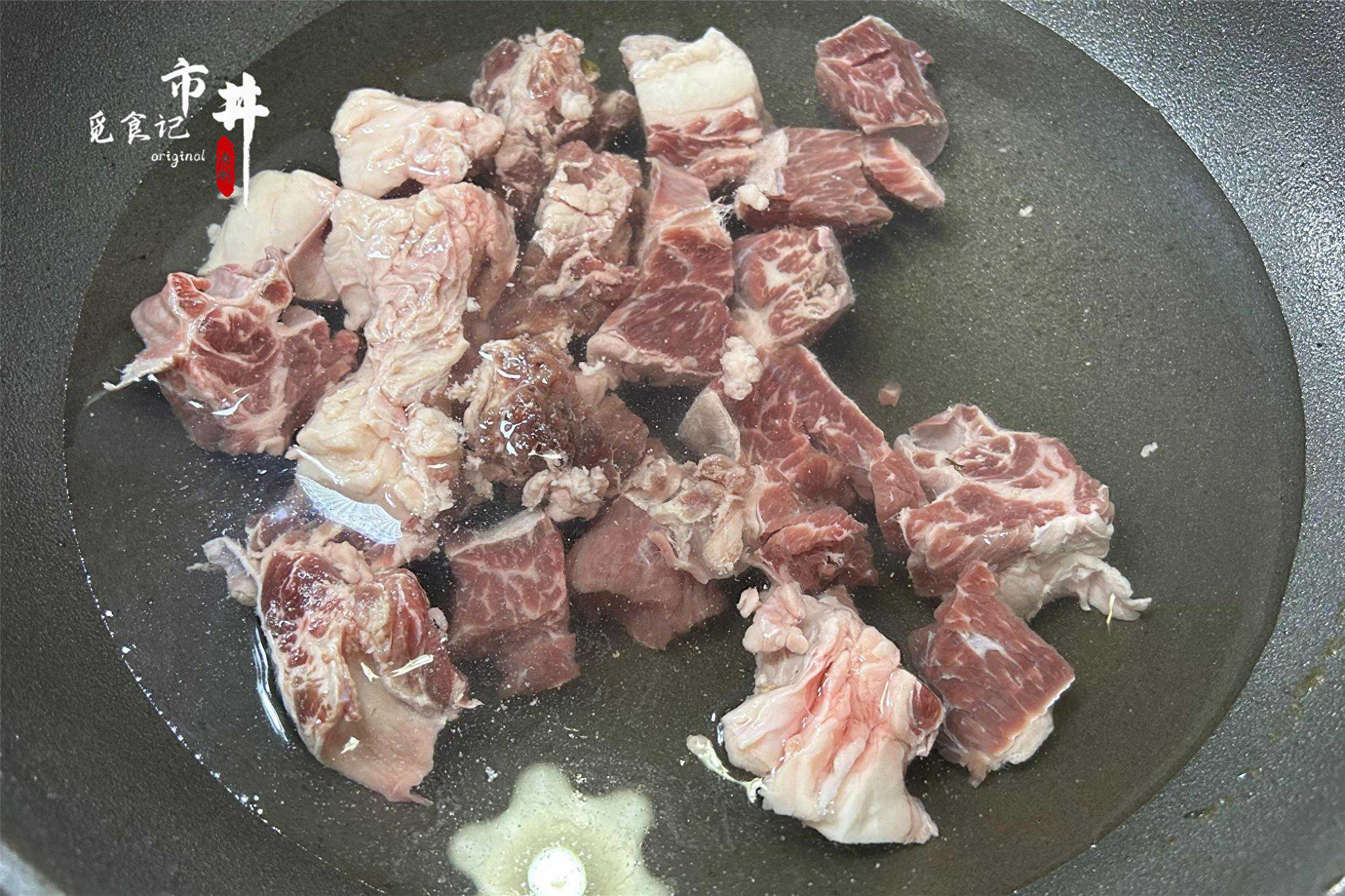 1、牛肉冷水下锅,加入少量黄酒,中火煮开后捞出控水备用。