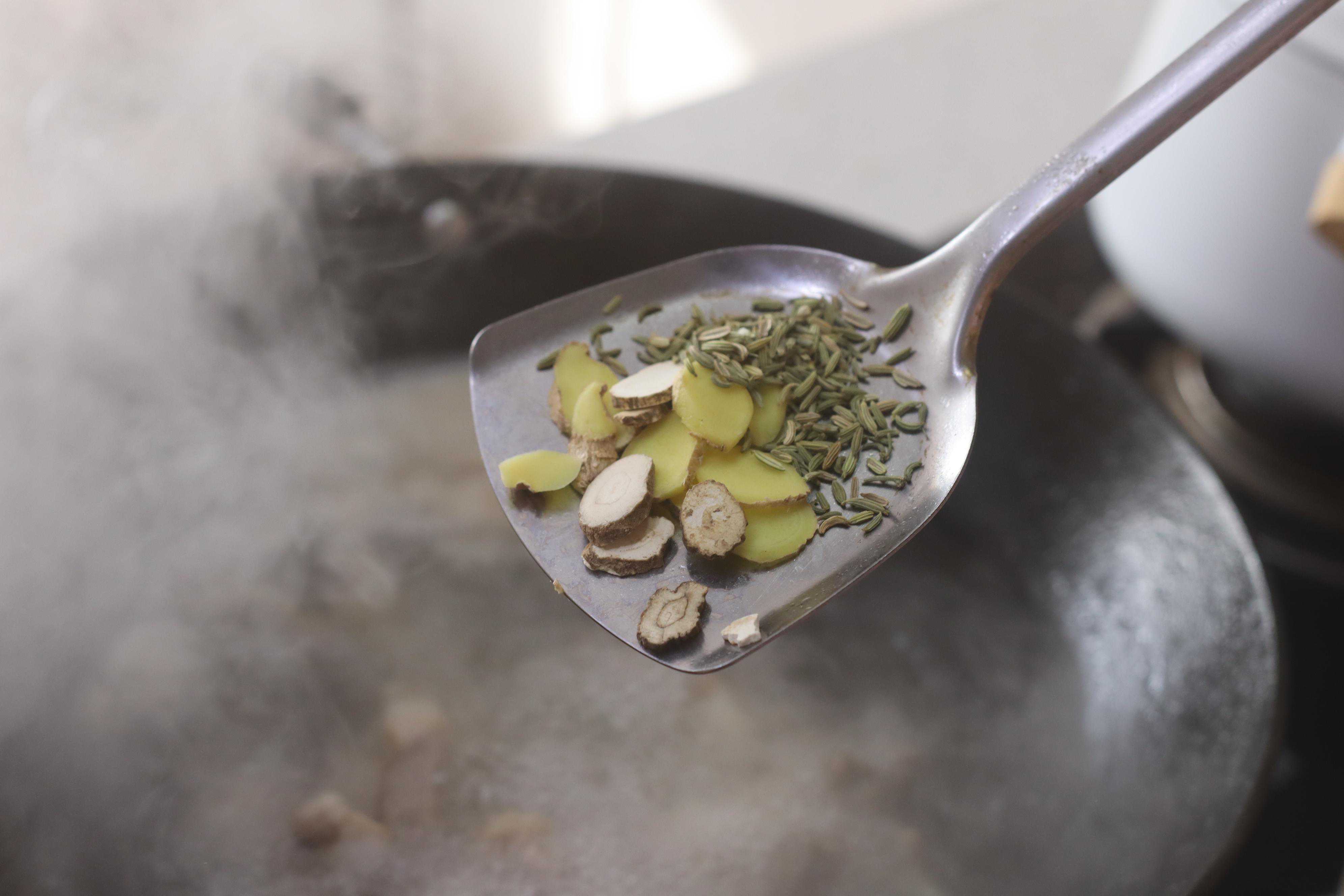 4、汤色开始略微变白后,这时候加入煮羊肉的“三件套”:白芷、小茴香、生姜,继续开盖煮10分钟,记住千万别加入八角。