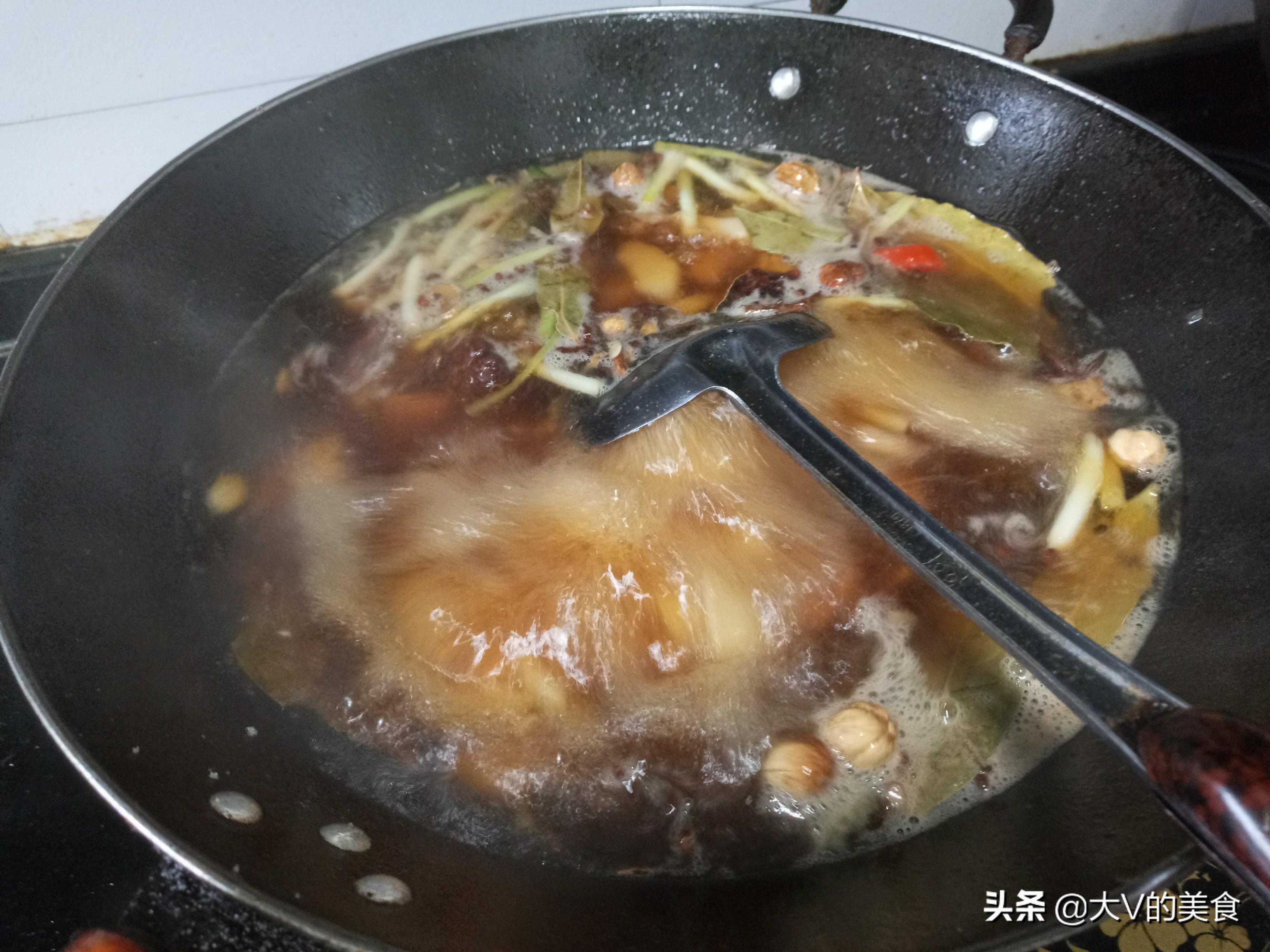 第三步熬制卤水。起锅烧油,油热把切好的酸芛蒜米生姜片放入锅里,加入香叶6片、八角3颗、花椒5克、草颗2个、桂皮1片,茴香5克,开中小火爆出香味。把做好的红糖水倒入锅里,加入盐5克、生油30克、蚝油20克、老抽10克、红腐乳汁10克,大火煮开然后调中小火煮10分钟调制成卤水。