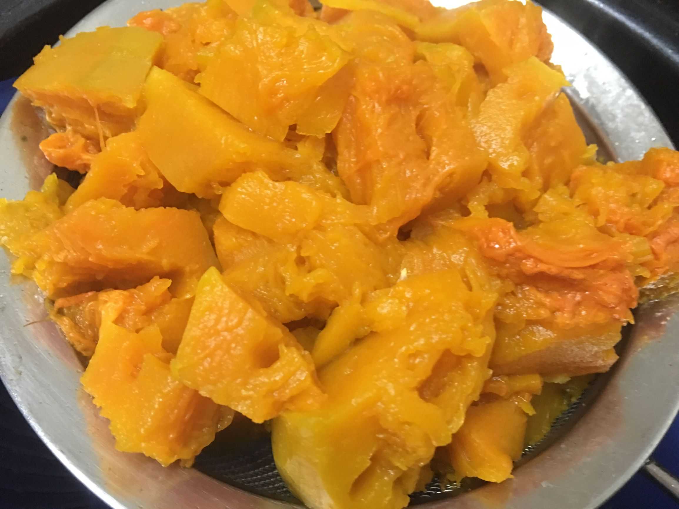 1、南瓜削皮切小块蒸熟,如果有微波炉直接叮熟更加好。蒸的南瓜水分很多,要先用筛子滤掉水分。