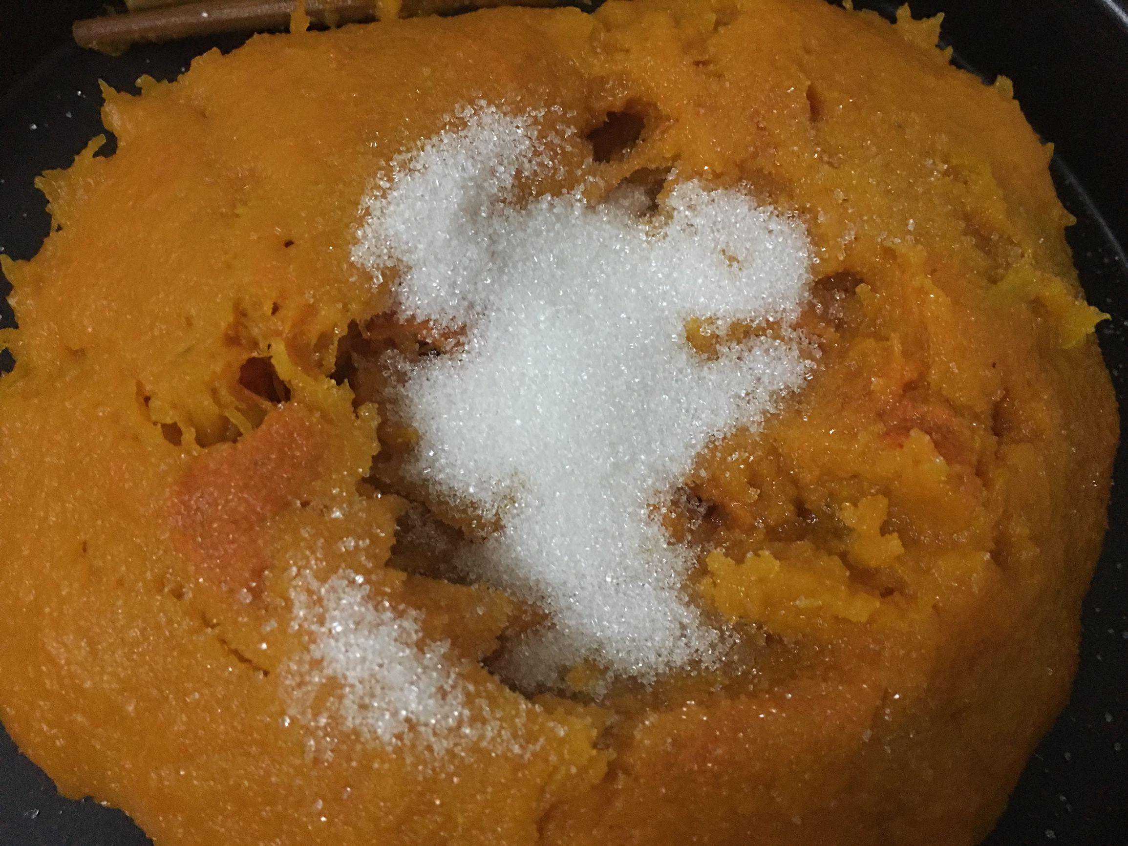 3、接着倒到大盘里面,加糖,糖要加得稍微多一些,南瓜虽然本来就甜,但是因为后面要放入糯米粉会降低甜度,所以糖要多点,喜欢甜的就再加些。