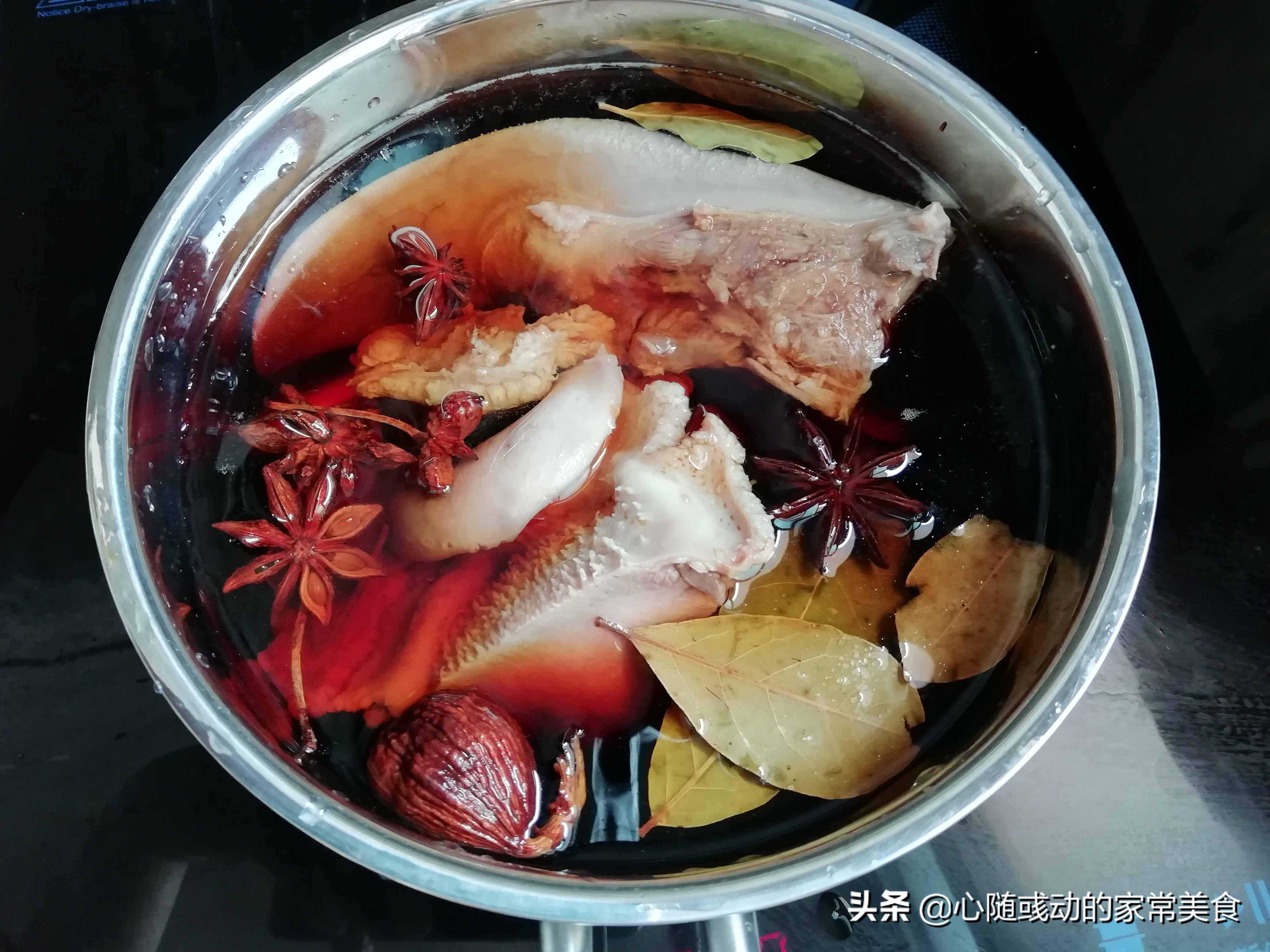 配料:红烧酱油两勺;料酒30克;老卤水20克;桂皮3块;八角5颗;香叶5片;生姜1块;草果1个;冰糖1小块;盐3克。