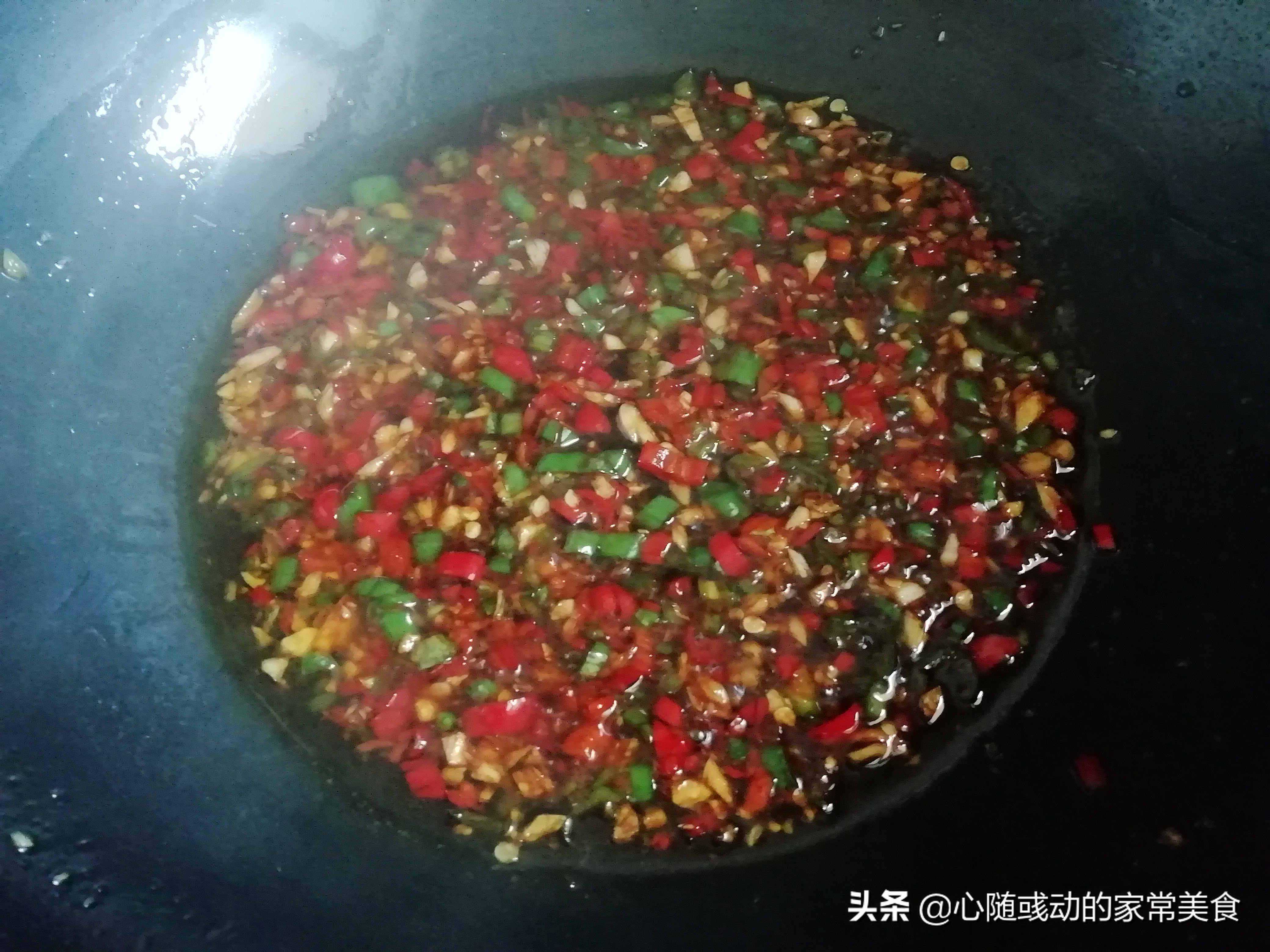第七步:起油锅,放入大蒜子和辣椒爆香。