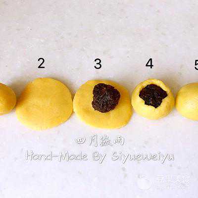 18、取一只面团,用掌心压扁、放入一只凤梨馅、利用虎口慢慢收口,团圆即可。这时烤箱预热170度上下火。