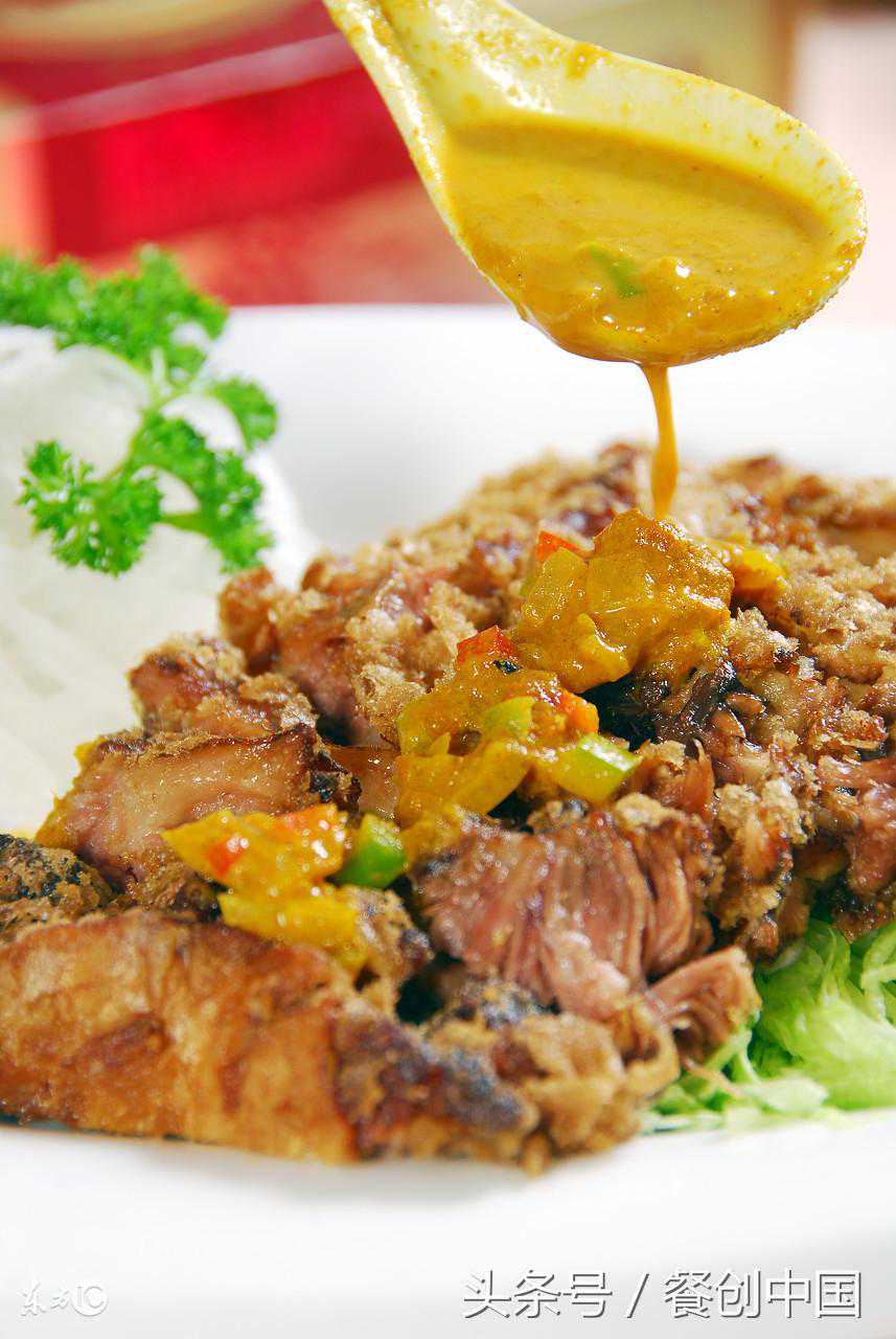 (4)锅里放色拉油烧至七成热时,取牛肉拖上脆皮糊,入锅炸至表面酥脆时,捞出改刀成厚斜片,装盘后随咖喱酱上桌蘸食。