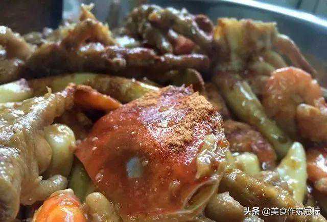 鸡爪炖至熟烂后,将处理好的虾和蟹并芡汁一起倒入锅内.待汤汁收到差不多后放入年糕,稍加翻炒,年糕软了即可盛出.