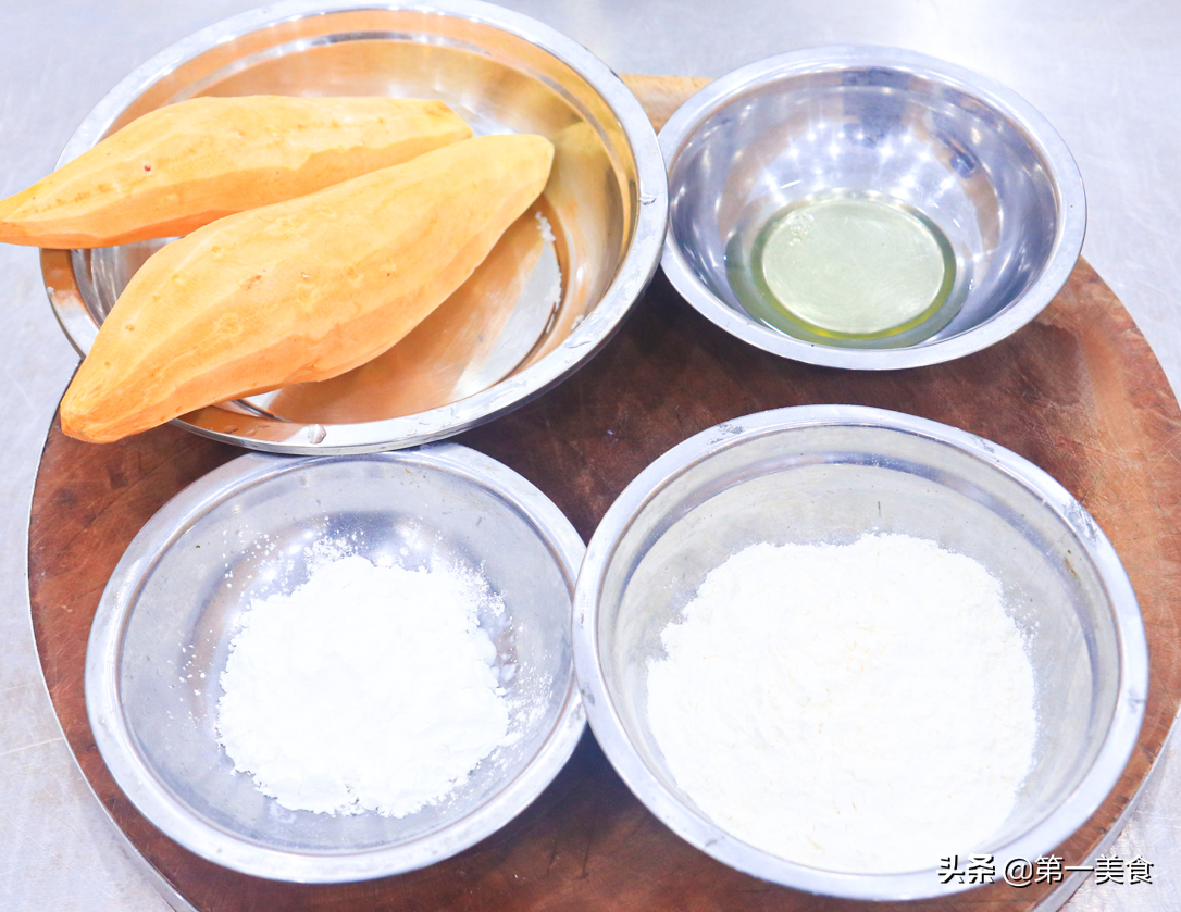 准备两个红薯、50克面粉、100克淀粉和一个蛋清。
