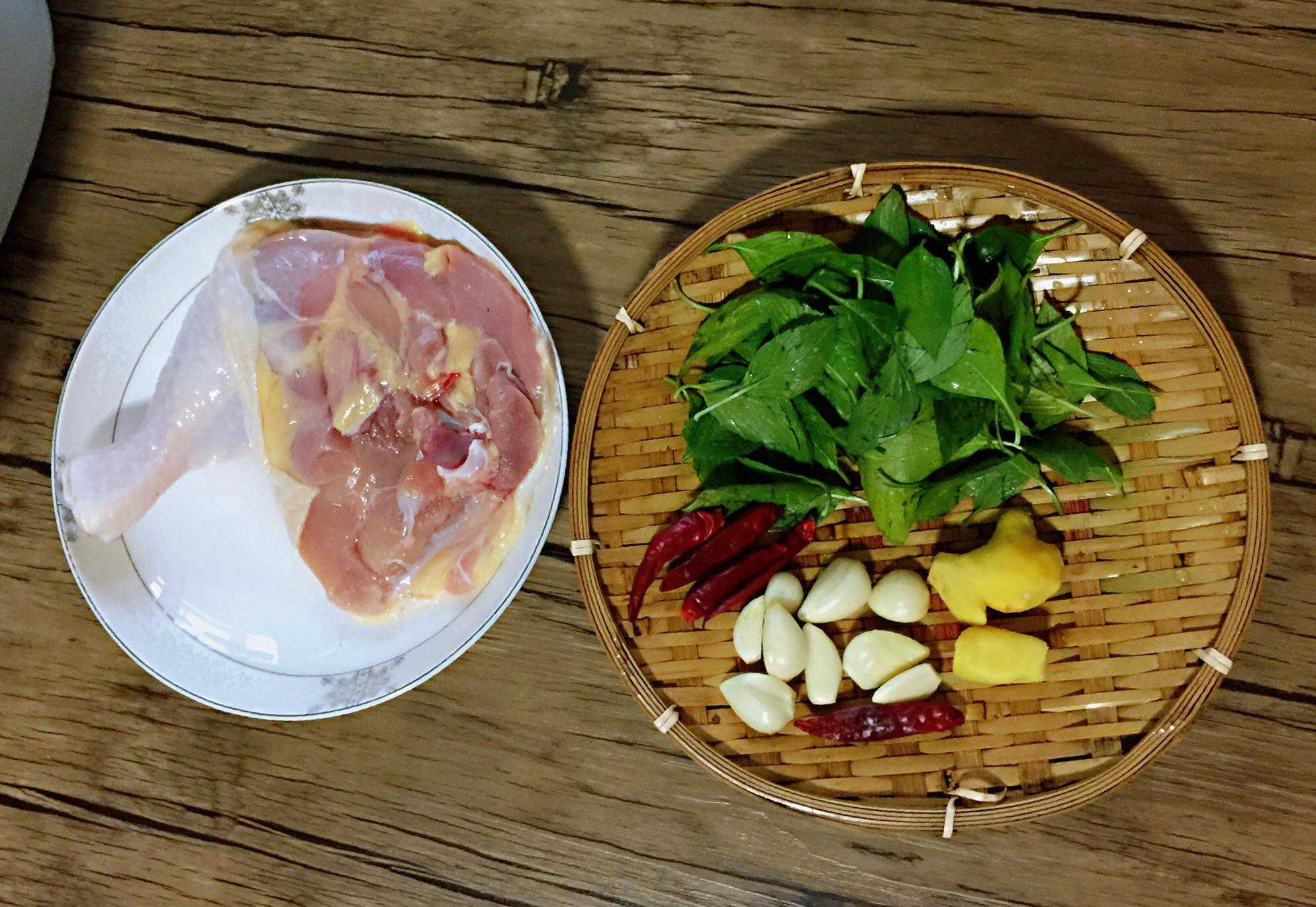 鸡大腿500g,米酒汁60ml,生抽50ml,玉米油20ml,胡麻油10ml,罗勒叶1把,冰糖15g,大蒜1头,生姜2小块,干红辣椒5个
