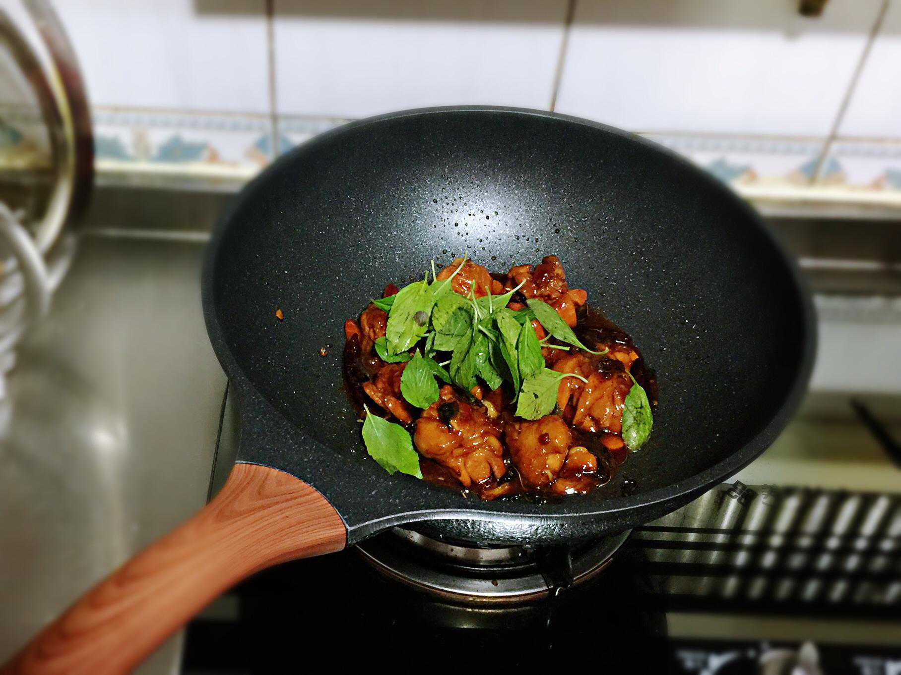 三杯鸡浓油赤酱,料汁浓厚,烹制过程中如果出现粘锅糊锅的现象,不仅影响成品菜的色泽、味道,刷洗粘附锅壁上的残垢也是即费力又伤手的事儿。因此挑选一口用得顺手而又不粘的锅具也是厨房里的一件幸福事。今天我还是用这个“双囍”饭麦石炒锅来焖烧三杯鸡。