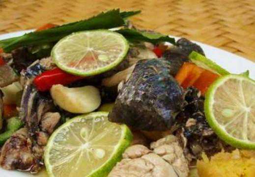 布朗族的传统名菜,鲜香俱全,味美可口。其制作方法:把鱼剖开洗净,将辣椒、盐等各种佐料切细拌匀后填入鱼腹内,再用芭蕉叶包好,捂在火塘的炭火下面,烧熟即可食用。
