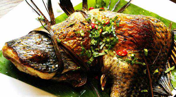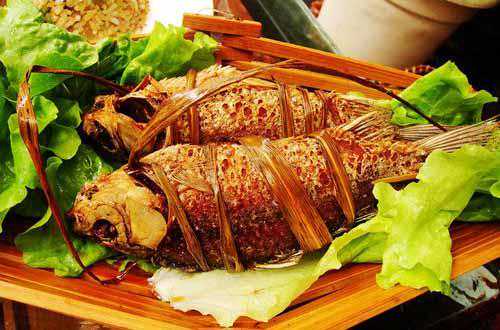 把鱼的鳞片去掉,用刀划开鱼背,去掉肠肚杂物,洗净;将葱、姜、蒜、青辣椒、芫荽切细,与盐拌拢;把佐料放进鱼肚子里,把鱼肚子合拢,用二三根香茅草叶捆好,用竹片夹紧,放在火炭上烘烤。待八成熟时,抹上猪油,继续烘烤5分钟左右,即可食用。这种烤鱼具有香、酥、脆的特点,极能增进食欲。